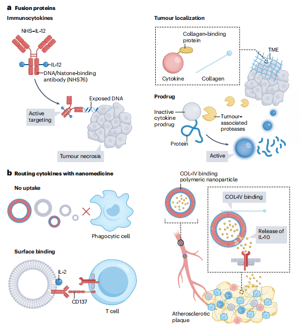免疫细胞是细胞因子的主要来源,在感染、炎症或内源性刺激下分泌。细胞因子与靶细胞上的受体结合后诱导细胞内信号,促进特定的生物学过程,具体取决于细胞因子和细胞类型,包括激活调节表观遗传修饰、细胞因子合成和增强代谢的酶,以及触发细胞增殖或凋亡。细胞因子的一个决定性特征是它们诱导不同表型特征的能力,导至各种生物学后果。由于细胞因子在许多免疫介导的疾病中起着关键作用,因此已将其作为治疗靶点进行了研究,如自身免疫和炎症性疾病。然而,开发基于细胞因子的疗法仍然具有挑战性。细胞因子的半衰期短、多效性和不利的组织分布都导至其治疗范围狭窄。 近日,一组来自世界各地的研究团队在杂志Nature reviews bioengineering上发表了一篇题为“Engineering cytokine therapeutics”的综述文章。研究团队首先讨论如何利用生物分析技术的进步来加深对细胞因子生物学的理解。然后描述了与细胞因子治疗相关的蛋白质工程、纳米医学、RNA技术和细胞工程方面的创新。研究团队表明,生物工程人员可以利用相关知识,为各种免疫介导疾病开发安全、有效的基于细胞因子的疗法。 图片来源:Nature reviews bioengineering 一 使用蛋白质工程工具设计重组细胞因子疗法 1. 定向进化 可以采用两种策略来开发蛋白质突变体;定向进化和蛋白质理性设计。在定向进化中,随机突变被引入感兴趣的基因中,随后使用多种选择方法,例如酵母和噬菌体展示,以获得具有所需功能的蛋白质。与理性设计相反,定向进化不依赖详细的结构知识和蛋白质3D结构预测,因为它基于突变体的功能选择。因此,定向进化是工程蛋白的一种流行且成功的策略。 2. 理性设计 已开发出合理重新设计细胞因子的方法,而不是使用定向进化。这些技术在很大程度上依赖于细胞因子结构的详细知识和先进的蛋白质模型。例如,IL-22的晶体结构与其受体复合物IL-22Rα/IL-10Rβ结合,使得通过突变四个关键氨基酸残基降低对IL-10Rβ的亲和力成为可能。这种IL-22突变体具有更高的受体和细胞特异性,从而减少了不良的促炎症反应,并保持了其体内再生功能。为了减少多效性,类似的方法设计了治疗有效的细胞因子变体,如IL-10、IFNγ、IL-12和IL-4。 3. 聚乙二醇化 细胞因子的循环半衰期决定了细胞因子疗法的体内效应。用聚乙二醇(PEG)使蛋白质功能化是延长其在循环中持久性的一种有效方法。聚乙二醇化增加了蛋白质的分子量,扩大了流体动力学直径,从而减少了肾脏清除率,并减少了与血浆成分的相互作用,从而降低了免疫原性。聚乙二醇化已成功应用于集落刺激因子和干扰素。 Synthorx设计了一种新的PEG-IL-2变体(THOR-707),THOR-707的PEG部分特异性阻断与IL-2Rα亚基的结合位点,但保持与其他受体亚基的相互作用(图b),改善了效应T细胞和NK细胞的扩增和激活,并在癌症模型中显示出更好的药代动力学和安全性特征。聚乙二醇化细胞因子的一个可能的限制是患者可能产生抗PEG抗体,该抗体可使细胞因子失活或引发炎性免疫反应。 4. 计算方法 借助于计算和数据驱动方法以及硬件和算法能力的最新进展,蛋白质可以从头设计。计算工具有望帮助克服细胞因子药物的关键限制,包括多效性、冗余性、不良药代动力学和毒性。可以采用从头蛋白质设计来创建合成细胞因子(合成蛋白),例如IL-2Rβ/IL-10Rβ、IL-2Rβ/IL-4Rα或IL-4Rβ/IFNαR2,从而激活不同的信号通路。从头设计方法还提供了一种有效分离细胞因子多效性和靶向特异性途径的策略。从头设计的蛋白质本质上是外来的,因此可能存在免疫原性问题,这是新细胞因子临床转化的重要考虑因素。 重组细胞因子。 图片来源:Nature reviews bioengineering 二 靶向和递送 1. 融合蛋白修饰细胞因子 在基因层面上融合一种细胞因子与其他蛋白质可以帮助重塑细胞因子的生物分布特征。该方法可用于将细胞因子靶向特定位点或细胞类型。细胞因子融合物有助于促进肿瘤定位,克服细胞因子药物不良的药代动力学财产和不利的生物分布特征。 免疫细胞因子:过去15年 多年来,已设计出具有IL-2的多抗体-细胞因子融合构建物,称为免疫细胞因子,并正在进行治疗各种类型癌症的临床试验。将IL-12基因融合到肿瘤靶向抗体可以增加这种细胞因子的治疗窗口并限制毒性,如将IL-12融合到L19抗体(抗Fibronectin,在许多癌症中过量表达在血管上)。大多数免疫细胞因子的目的是向肿瘤输送促炎细胞因子,但也可以将抗炎细胞因子导向炎症组织。IL-22免疫细胞因子靶向肠道黏膜以治疗溃疡性结肠炎。 免疫细胞因子与非靶细胞的相互作用会引起副作用。为了提高受体和细胞特异性,新的工程疗法将免疫细胞因子方法与重组细胞因子突变体相结合。比如Orionis Biosciences正在开发一种AcTakines,它结合了靶向抗体和受体亲和力降低的细胞因子突变体。AcTakines的亲和力降低会阻碍细胞因子活性,直到融合蛋白在靶细胞上的细胞因子受体附近聚集,从而降低脱靶效应。 肿瘤定位:胶原蛋白是TME(肿瘤微环境)的主要成分,因此是细胞因子肿瘤定位的有趣靶点。有研究团队将胶原结合蛋白与IL-2或IL-12融合,在肿瘤内给药时将这些细胞因子锚定在TME中的胶原上(下图a)。 前药策略:克服脱靶效应的一种方法是设计前药结构,通过与细胞因子连接的肽或蛋白质使其失去活性。例如,失活单元可以被疾病部位过表达的蛋白酶