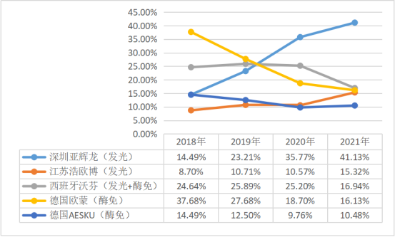 通过对近四年CRDC数据(以抗ENA抗体为例)分析,可以看出外资品牌的占比从2018年的71.08%下降到了2021年的59.11%,国产品牌的占比从2018年的28.92%上升到了2021年的40.89%。这在一定程度上表明了国产品牌在这些年来逐步发展,并且市场份额不断扩大的趋势。