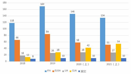 近几年的CRDC数据(以抗dsDNA抗体为例)显示,间接免疫荧光法(IFA)仍然是应用最广泛的方法学,另外,酶联免疫法从2018年的66家降到了2021年的51家,而化学发光法从2018年的13家上升到2021年的54家,已经显示出逐步被化学发光法替换的趋势。