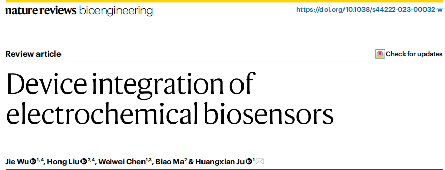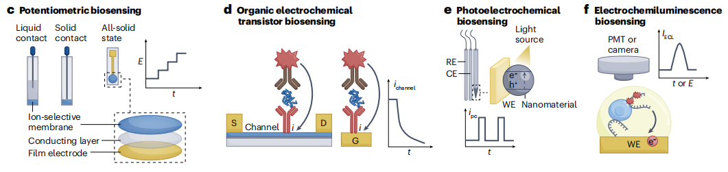 自1962年Leland-Clark Jr引入用于葡萄糖电流型传感器以来,生物传感器已被广泛应用于临床、工业、环境和农业分析。尽管已经开发了各种生物传感器来灵敏和选择性地检测一系列与疾病相关的分子,但由于难以将生物传感器集成到便携式设备中并使其小型化,生物传感器的临床转化仍然有限。 在不同的生物传感平台中,电化学生物传感器特别适合于设备集成,因为易小型化、批量制造,电流和电势等电化学信号可以通过简单、便携、低成本的低功耗外围仪器进行采集。科学技术的进步引领了电化学生物传感器在可穿戴和植入式设备中的集成,来实现对生理分子的微创或无创连续测量。电化学生物传感器可以集成到柔性薄膜、纺织品、眼镜、牙齿和尿布中,来实现对不同生物流体(例如脑脊液、间质液、汗液、唾液、眼泪和尿液)中分子的长期检测。 近日,来自南京大学、东南大学、南京邮电大学的研究团队在杂志Nature reviews bioengineering上发表了一篇题为“Device integration of electrochemical biosensors”的综述。在这篇综述中,研究团队讨论了用于个性化POC诊断设备的电化学生物传感的关键创新。讨论了用于疾病诊断、健康管理、细胞监测和神经科学的电流型、电位型、有机电化学晶体管(OECT)、光电化学和电化学发光生物传感器的设计和集成,以及未来需要努力的方向。 图片来源:Nature reviews bioengineering 一、电化学传感概述 电化学生物传感器是独立的分析设备,其中生物识别元件与电化学转导元件直接接触,以允许对分析物进行灵敏和特异的检测。根据设计和传感器类型,可以在不同体液(包括血液、唾液和眼泪)中快速分析与健康相关和疾病相关的生物标志物(如下图a),如碳水化合物、蛋白质、核酸和细胞。电化学生物传感器,包括电流法、伏安法、电位法、有机电化学晶体管、光电化学和电化学发光传感器,可以集成到可穿戴、便携式和植入式设备中,以实现护理点诊断和健康监测。 电流型生物传感器:电流型生物传感器是检测代谢物(例如葡萄糖、乳酸和尿酸)最常用的传感器。靶特异性酶(例如,葡萄糖氧化酶(GOx)、或乳酸氧化酶)固定在工作电极上,以恒定电位催化靶的氧化(如下图b)。电流型生物传感器制造简单,在目标检测中具有高灵敏度和高选择性,适用于可穿戴应用。纳米材料也可以添加到生物传感界面促进电子转移,从而提高灵敏度并降低检测极限。例如,Au-Pt双金属纳米催化剂与纳米多孔水凝胶相结合,能够以180 μA cm–2 mmol–1的灵敏度,0.01 mg dl−1(0.56 μM)的检测限,使生物传感器与用于泪液葡萄糖测量的智能隐形眼镜集成。 伏安法生物传感器:疾病生物标志物,如蛋白质和核酸,是通过亲和识别来检测的,不能在生物传感表面直接产生电子转移。大多数亲和传感器都是伏安生物传感器,操作繁琐(下图b)。一步亲和传感器提供了一种更简单的方案,靶标的检测依赖于结合诱导的探针DNA刚性的变化,导至氧化还原标签靠近或远离电极表面,导至靶标生物传感的电流信号相应增加或减少。该信号可以使用DNA杂交策略进行扩增以提高敏感性;发夹DNA探针可以进一步提高这种DNA传感器的灵敏度。 基于邻近结合的亲和电化学生物传感器适用于蛋白质生物标志物检测。在这种生物传感器中,一对抗体-DNA亲和探针双重识别靶蛋白,启动DNA组装,导至电极表面上的电活性分子标记的探针DNA处于“开”或“关”状态。此类传感器的灵敏度可以通过DNA扩增策略进一步提高降至皮克每毫升或亚皮摩尔水平。 电化学生物传感器。 图片来源:Nature reviews bioengineering 电位生物传感器:电位生物传感器通过测量与传感电极上的目标识别时表面电荷变化相关的电位信号,可以直接检测目标(下图c)。固体和液体膜电极可以集成到临床分析仪中,用于检测血液电解质(例如,Na+、K+、Ca2+、H+和Cl-)。酶、核酸和蛋白质可以通过将目标生物识别事件与离子反应相结合来检测。固体接触离子选择电极受益于坚固性和易于制造、修饰和小型化,允许通过检测从纳米粒子标记的探针释放的离子来进行蛋白质和核酸分析。所有固态离子选择电极也可以集成到可穿戴设备中,用于生物流体中的离子检测;例如,在柔性传感阵列上具有Na+和K+离子选择电极的可穿戴“智能腕带”能够对汗液中的Na+和K+进行原位分析。 有机电化学晶体管生物传感器:OECT生物传感器(下图d)与靶标的特定反应影响界面电位,从而产生用于靶标定量的通道电流响应。OECT生物传感器具有高灵敏度、低成本、灵活性、易于制造和低工作电压 ,允许通过静电相互作用或亲和力结合来检测电活性(例如多巴胺、葡萄糖和肾上腺素)和无电活性(例如皮质醇、DNA、蛋白质、细菌、细胞和聚糖)分子或生物大分子。 OECT生物传感器可以很容易地小型化、集成到设备中并设计成阵列。OECT生物传感器的灵活性和稳健性使其适用于可穿戴设备中生物分子的非侵入性检测。例如,织物OECT生物传感器可以嵌入尿布中,以监测人工尿液中的葡萄糖,通过蓝牙在手机上收集传感信号。 光电化学生物传感器:光电化学生物传感系统基于在生物传感器表面识别目标时光电流的变化,这由于电子供体和受体之间的光电化学反应而引起电荷或能量转移。光电化学生物传感器结合了光学和电化学分析的优势,特别是用于检测疾病相关分子,如谷胱甘肽、乳酸、DNA、miR