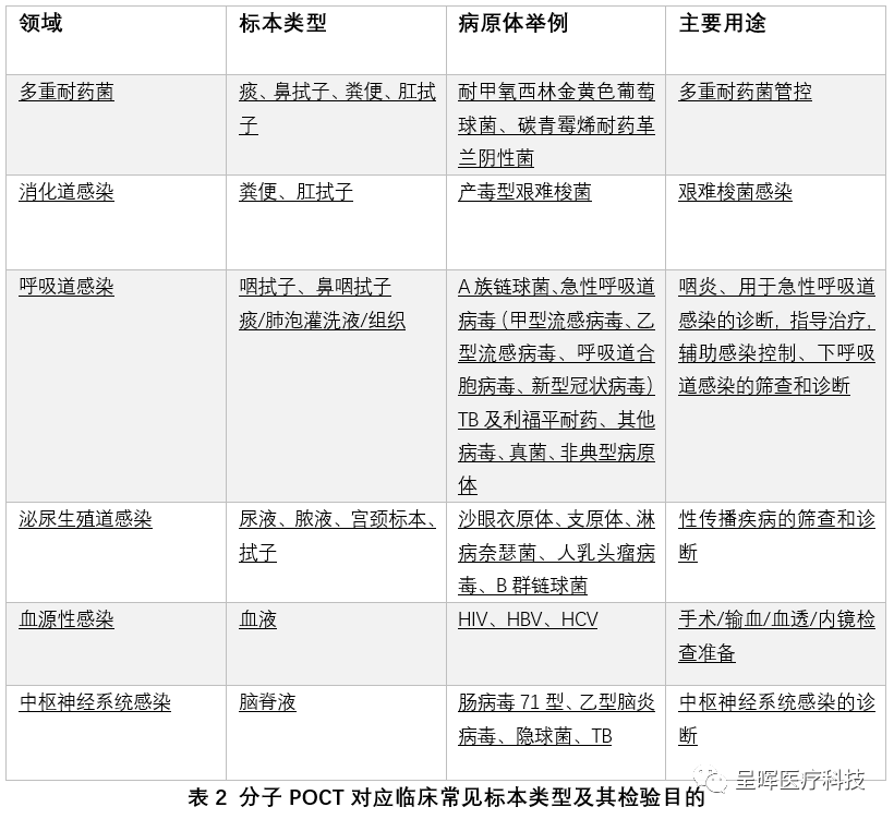 2021年7月发布的《病原体核酸即时检测质量管理要求专家共识》里面对于分子POCT的应用场景、检测标本类型、检测的病原体以及主要用途都有详细罗列。具体可以参见下面的两个表格: 从表1和表2我们也可以看到,其主要的应用场景、检测的病原体、标本类型以及检验目的与GeneXpert和FilmArray在欧美国家的使用情况并无太大区别。