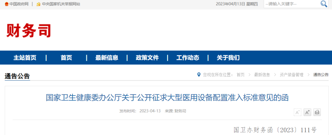 | 图| 拍信创意 今日(4月13日),国家卫健委官网发布《国家卫生健康委办公厅关于公开征求大型医用设备配置准入标准意见的函》(简称《意见函》)。 《意见函》指出,国家卫健委正组织专家对大型医用设备配置标准进行修订,并起草了《甲类大型医用设备配置准入标准(征求意见稿)》《乙类大型医用设备配置标准指引(征求意见稿)》(完整文件见文末),现面向社会公开征求意见。