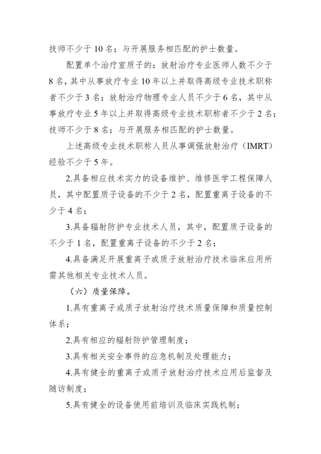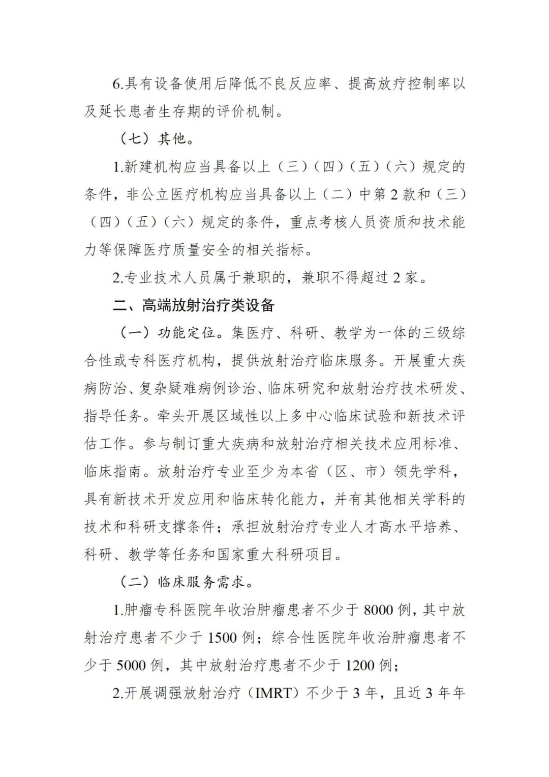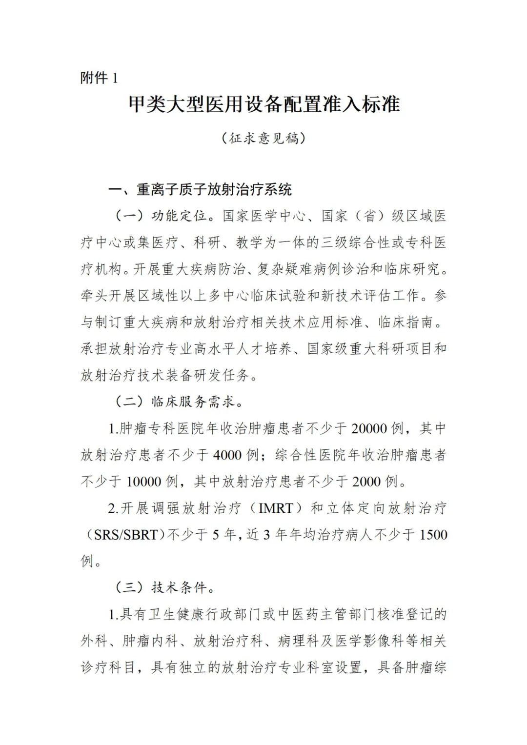 一个月前,国家卫健委刚刚发布《大型医用设备配置许可管理目录(2023年)》,与2018年版目录相比,管理品目由10个调整为6个,其中,甲类由4个调减为2个,乙类由6个调减为4个。 此时出台《意见函》,对于大型医用设备后续进院工作影响深远。 根据《甲类大型医用设备配置准入标准(征求意见稿)》,此次修订集中在重离子质子放射治疗系统和高端放射治疗类设备这两部分。 |重离子质子放射治疗系统 功能定位方面,需国家医学中心、国家(省)级区域医疗中心或集医疗、科研、教学为一体的三级综合性或专科医疗机构。开展重大疾病防治、复杂疑难病例诊治和临床研究。牵头开展区域性以上多中心临床试验和新技术评估工作。参与制订重大疾病和放射治疗相关技术应用标准、临床指南。承担放射治疗专业高水平人才培养、国家级重大科研项目和放射治疗技术装备研发任务。 临床服务需求方面,肿瘤专科医院年收治肿瘤患者不少于20000例,其中放射治疗患者不少于4000例;综合性医院年收治肿瘤患者不少于10000例,其中放射治疗患者不少于2000例。 此外,开展调强放射治疗(IMRT)和立体定向放射治疗(SRS/SBRT)不少于5年,近3年年均治疗病人不少于1500例。 技术条件方面,需具有卫生健康行政部门或中医药主管部门核准登记的外科、肿瘤内科、放射治疗科、病理科及医学影像科等相关诊疗科目,具有独立的放射治疗专业科室设置,具备肿瘤综合诊治能力;具有多模态影像引导放射治疗计划设计与执行能力,常规开展质量保证和质量控制。 配套设施设备及相关条件 1.配备放疗专用CT模拟定位机; 2.配备CT、MR、PET/CT等影像诊断设备; 3.配备可开展 IMRT、IGRT、SRS/SBRT的直线加速器不少于2台; 4.配备重离子或质子治疗相应的物理质控设备; 5.具有相应的放疗计划系统和信息管理系统; 6.符合卫生健康和环保部门要求,具有电磁与辐射防护设施场地; 7.具备5年内完成采购和安装的条件。 专业技术人员资质和能力方面,配置重离子治疗设备的:放射治疗专业医师不少于15名,其中从事放疗专业10年以上并取得高级专业技术职称者不少于6名;放射治疗物理专业人员不少于10名,其中从事放疗专业5年以上并取得高级专业技术职称者不少于3名;技师不少于15名;与开展服务相匹配的护士数量。 配置多个治疗室质子的:放射治疗专业医师不少于12名,其中从事放疗专业10年以上并取得高级专业技术职称者不少于4名;放射治疗物理专业人员不少于8名,其中从事放疗专业5年以上并取得高级专业技术职称者不少于3名;技师不少于10名;与开展服务相匹配的护士数量。 配置单个治疗室质子的:放射治疗专业医师人数不少于8名,其中从事放疗专业10年以上并取得高级专业技术职称者不少于3名;放射治疗物理专业人员不少于6名,其中从事放疗专业5年以上并取得高级专业技术职称者不少于2名;技师不少于8名;与开展服务相匹配的护士数量。 值得注意的是,根据文件要求,上述高级专业技术职称人员从事调强放射治疗(IMRT)经验不少于5年。 此外,还需具备相应技术实力的设备维护、维修医学工程保障人员,其中配置质子设备的不少于2名,配置重离子设备的不少于4名;具备辐射防护专业技术人员,其中,配置质子设备的不少于1名,配置重离子设备的不少于2名;具备满足开展重离子或质子放射治疗技术临床应用所需其他相关专业技术人员。 |高端放射治疗类设备 功能定位方面,需为集医疗、科研、教学为一体的三级综合性或专科医疗机构,提供放射治疗临床服务。开展重大疾病防治、复杂疑难病例诊治、临床研究和放射治疗技术研发、指导任务。牵头开展区域性以上多中心临床试验和新技术评估工作。参与制订重大疾病和放射治疗相关技术应用标准、临床指南。放射治疗专业至少为本省(区、市)领先学科,具有新技术开发应用和临床转化能力,并有其他相关学科的技术和科研支撑条件;承担放射治疗专业人才高水平培养、科研、教学等任务和国家重大科研项目。 临床服务需求方面,肿瘤专科医院年收治肿瘤患者不少于8000例,其中放射治疗患者不少于1500例;综合性医院年收治肿瘤患者不少于5000例,其中放射治疗患者不少于1200例; 此外,开展调强放射治疗(IMRT)不少于3年,且近3年年均治疗例数不少于1000例。 技术条件方面,需具有独立的放射治疗专业科室设置,且肿瘤外科、肿瘤内科、放射治疗科、病理科及医学影像科等学科为省级以上实力较强学科;具有多模态影像引导放射治疗计划设计与执行能力,常规开展质量保证和质量控制。 配套设施设备及相关条件 1.配备放疗专用CT模拟定位机; 2.配备CT、MR、PET/CT; 3.配备可开展IMRT、IGRT的直线加速器; 4.配备完善的物理质控设备; 5.具有相应的放疗计划系统和信息化管理系统; 6.符合卫生健康和环保部门要求,具有电磁与辐射防护设施场地; 7.具备在2年内完成采购和安装的条件。 专业技术人员资质和能力方面,要求放射治疗专业医师人数不少于5名,其中从事放疗专业10年以上并取得高级专业技术职称者不少于2名;放射治疗物理人员不少于5名,其中从事放疗专业5年以上并取得高级专业技术职称者不少于2名;技师不少于6名;与开展服务相匹配的护士数量;需具备相应技术实力的设备维护、维修医学工程保障人员不少于2名;具有相关卫生专业技术人员。 根据文件,乙类大型医用设备配置