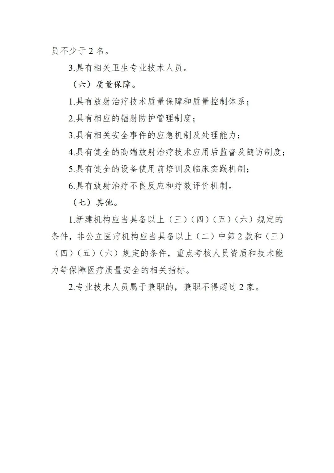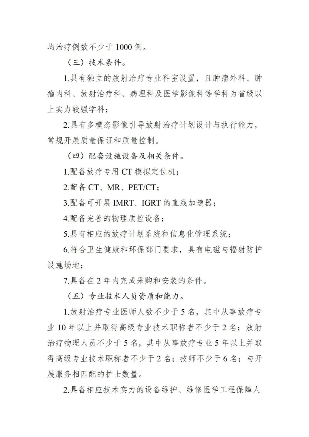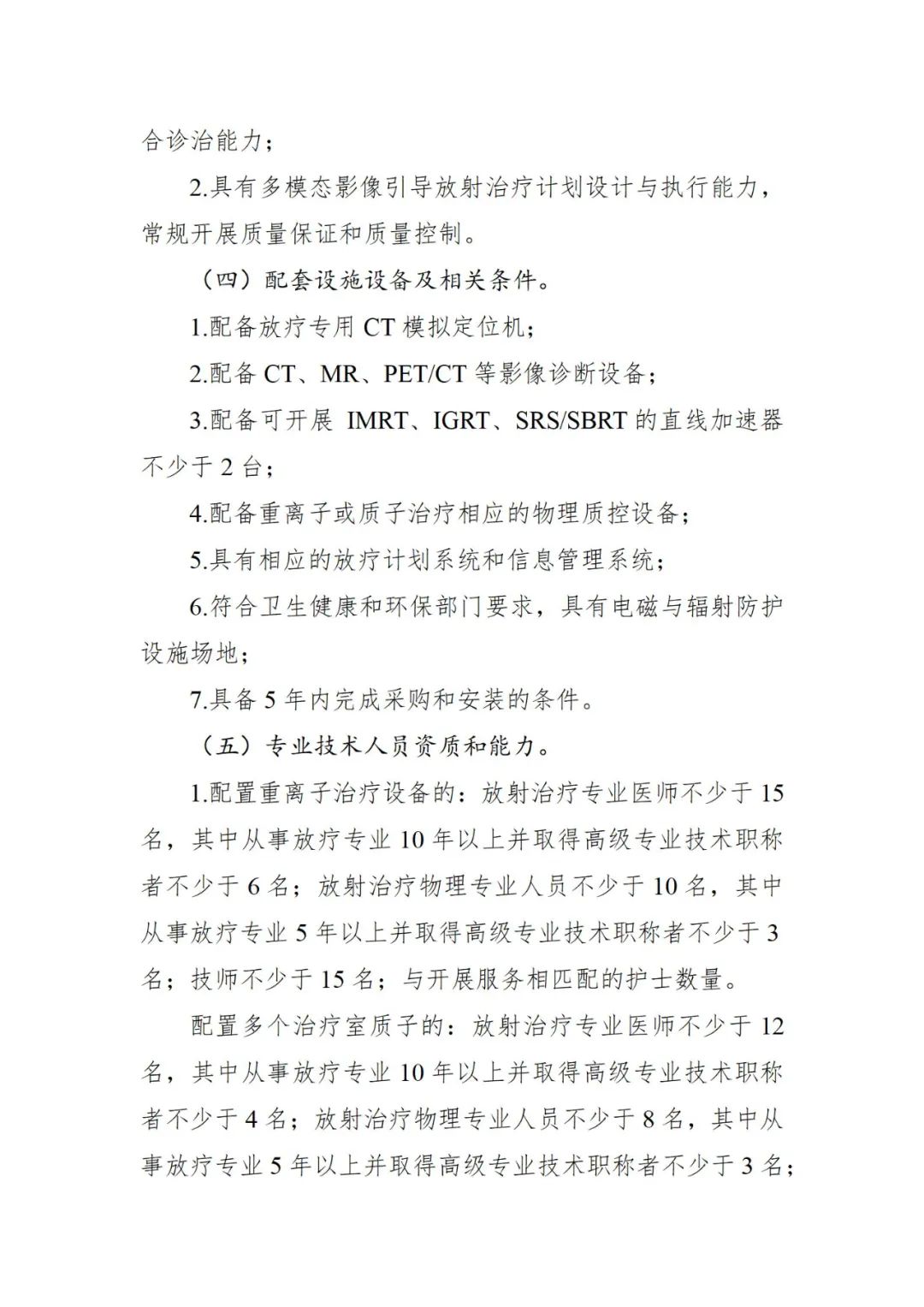 一个月前,国家卫健委刚刚发布《大型医用设备配置许可管理目录(2023年)》,与2018年版目录相比,管理品目由10个调整为6个,其中,甲类由4个调减为2个,乙类由6个调减为4个。 此时出台《意见函》,对于大型医用设备后续进院工作影响深远。 根据《甲类大型医用设备配置准入标准(征求意见稿)》,此次修订集中在重离子质子放射治疗系统和高端放射治疗类设备这两部分。 |重离子质子放射治疗系统 功能定位方面,需国家医学中心、国家(省)级区域医疗中心或集医疗、科研、教学为一体的三级综合性或专科医疗机构。开展重大疾病防治、复杂疑难病例诊治和临床研究。牵头开展区域性以上多中心临床试验和新技术评估工作。参与制订重大疾病和放射治疗相关技术应用标准、临床指南。承担放射治疗专业高水平人才培养、国家级重大科研项目和放射治疗技术装备研发任务。 临床服务需求方面,肿瘤专科医院年收治肿瘤患者不少于20000例,其中放射治疗患者不少于4000例;综合性医院年收治肿瘤患者不少于10000例,其中放射治疗患者不少于2000例。 此外,开展调强放射治疗(IMRT)和立体定向放射治疗(SRS/SBRT)不少于5年,近3年年均治疗病人不少于1500例。 技术条件方面,需具有卫生健康行政部门或中医药主管部门核准登记的外科、肿瘤内科、放射治疗科、病理科及医学影像科等相关诊疗科目,具有独立的放射治疗专业科室设置,具备肿瘤综合诊治能力;具有多模态影像引导放射治疗计划设计与执行能力,常规开展质量保证和质量控制。 配套设施设备及相关条件 1.配备放疗专用CT模拟定位机; 2.配备CT、MR、PET/CT等影像诊断设备; 3.配备可开展 IMRT、IGRT、SRS/SBRT的直线加速器不少于2台; 4.配备重离子或质子治疗相应的物理质控设备; 5.具有相应的放疗计划系统和信息管理系统; 6.符合卫生健康和环保部门要求,具有电磁与辐射防护设施场地; 7.具备5年内完成采购和安装的条件。 专业技术人员资质和能力方面,配置重离子治疗设备的:放射治疗专业医师不少于15名,其中从事放疗专业10年以上并取得高级专业技术职称者不少于6名;放射治疗物理专业人员不少于10名,其中从事放疗专业5年以上并取得高级专业技术职称者不少于3名;技师不少于15名;与开展服务相匹配的护士数量。 配置多个治疗室质子的:放射治疗专业医师不少于12名,其中从事放疗专业10年以上并取得高级专业技术职称者不少于4名;放射治疗物理专业人员不少于8名,其中从事放疗专业5年以上并取得高级专业技术职称者不少于3名;技师不少于10名;与开展服务相匹配的护士数量。 配置单个治疗室质子的:放射治疗专业医师人数不少于8名,其中从事放疗专业10年以上并取得高级专业技术职称者不少于3名;放射治疗物理专业人员不少于6名,其中从事放疗专业5年以上并取得高级专业技术职称者不少于2名;技师不少于8名;与开展服务相匹配的护士数量。 值得注意的是,根据文件要求,上述高级专业技术职称人员从事调强放射治疗(IMRT)经验不少于5年。 此外,还需具备相应技术实力的设备维护、维修医学工程保障人员,其中配置质子设备的不少于2名,配置重离子设备的不少于4名;具备辐射防护专业技术人员,其中,配置质子设备的不少于1名,配置重离子设备的不少于2名;具备满足开展重离子或质子放射治疗技术临床应用所需其他相关专业技术人员。 |高端放射治疗类设备 功能定位方面,需为集医疗、科研、教学为一体的三级综合性或专科医疗机构,提供放射治疗临床服务。开展重大疾病防治、复杂疑难病例诊治、临床研究和放射治疗技术研发、指导任务。牵头开展区域性以上多中心临床试验和新技术评估工作。参与制订重大疾病和放射治疗相关技术应用标准、临床指南。放射治疗专业至少为本省(区、市)领先学科,具有新技术开发应用和临床转化能力,并有其他相关学科的技术和科研支撑条件;承担放射治疗专业人才高水平培养、科研、教学等任务和国家重大科研项目。 临床服务需求方面,肿瘤专科医院年收治肿瘤患者不少于8000例,其中放射治疗患者不少于1500例;综合性医院年收治肿瘤患者不少于5000例,其中放射治疗患者不少于1200例; 此外,开展调强放射治疗(IMRT)不少于3年,且近3年年均治疗例数不少于1000例。 技术条件方面,需具有独立的放射治疗专业科室设置,且肿瘤外科、肿瘤内科、放射治疗科、病理科及医学影像科等学科为省级以上实力较强学科;具有多模态影像引导放射治疗计划设计与执行能力,常规开展质量保证和质量控制。 配套设施设备及相关条件 1.配备放疗专用CT模拟定位机; 2.配备CT、MR、PET/CT; 3.配备可开展IMRT、IGRT的直线加速器; 4.配备完善的物理质控设备; 5.具有相应的放疗计划系统和信息化管理系统; 6.符合卫生健康和环保部门要求,具有电磁与辐射防护设施场地; 7.具备在2年内完成采购和安装的条件。 专业技术人员资质和能力方面,要求放射治疗专业医师人数不少于5名,其中从事放疗专业10年以上并取得高级专业技术职称者不少于2名;放射治疗物理人员不少于5名,其中从事放疗专业5年以上并取得高级专业技术职称者不少于2名;技师不少于6名;与开展服务相匹配的护士数量;需具备相应技术实力的设备维护、维修医学工程保障人员不少于2名;具有相关卫生专业技术人员。 根据文件,乙类大型医用设备配置