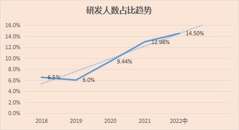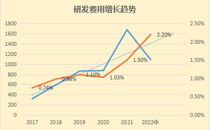 在研发投入上,2017年-2021年1-6月的研发费用分别为317.44万元、589.88万元、863.40万元、873.38万元、1676.81万元,占营业收入的比例分别为0.74%、0.98%、1.10%,1.03%,和1.5%,占比低于销售费用和管理费用。另外从2022年的数据来看研发人员数量来看80人,占比14.5%。