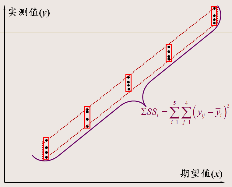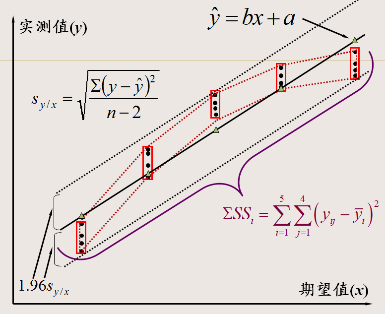 介绍CLSI EP6-P文件/ 定量检验线性性能评价 冯 仁 丰 病人结果检测范围,也即方法或检测系统的线性范围。 评价实验要求 1、进行检测范围实验的样品必须和真实样品尽可能相似,也即要和真实样品具相同的基质状态。 2、最好有5个或以上的系列浓度的实验样品,浓度范围遍布整个检测范围。最高浓度的样品应达到检测范围的上限。各实验样品内含分析物浓度间呈等比例关系,不要呈倍比关系。 3、加入的“浓储存液”体积不超过十分之一。 5L、4L+1H、3L+2H、2L+3H、1L+4H、5H 4. 每个样品至少作4次重复测定。 统计处理 1、若有5个浓度,每个浓度进行4次测定,则将所有20对(x,y)结果点于坐标纸上,观察有无线性表现。有线性的进行直线回归处理。 2、不取均值,直接对20对结果作回归处理。 3、直线回归式: 预期值为x,实测值为y。 为回归线上在对应x下的y值。 理想状态:b=1,a=0; 问题:绘制的回归线是作直线回归处理,所以画出来的线是直线。但是,实验结果是否能被确认,各个浓度间确实具有良好的线性关系,这才是最真实的。EP6-P就是用于判断线性的文件。 图1:线性评价中的直线回归 EP6-P文件基本原理 一、统计上评价线性的意义 EP6-P对线性数据处理的依据:线性数据的直线回归表现。 图2:线性评价中回归直线的意义 图3:线性评价的各组数据重复检测值的方差 进行回归处理的前提: 对实验数据的可靠性进行核查。 第一,各实验样品的重复数据中有无离群点; 第二,各实验样品重复数据组间的方差大小是否比较一致,即:是否某组的方差较其他组的方差大得多;若是这样,那么非线性不一定是真实的,是实验操作不精密度差所致。只有这两方面都符合要求,才可进行线性的统计检验。 图4:EP6-P线性评价5组样品重复检测结果的方差表现。 线性实验的总方差 线性实验的总方差反映了实验的总不精密度: 注:按照EP6-P线性评价实验方案,共有5个样品(i=5);每个样品进行了4次重复检测,j=4。 图5:线性评价实验数据点的方差 图6:线性评价实验数据点方差与回归直线的关系。 检测范围表现为直线时,各组数据实验具有的总方差(不精密度)为: 这些数据直线回归处理,所有实验点对于线的离散方差为: 由图说明,回归配合后引入的误差估计量,基本上就是由各组点的不精密度量总和ΣSS组成。 在EP6-P线性评价中,令这二者的差为“线性失拟误差(Lack of Fit,LOF)”。 求方差: (注:式中TE即ΣSS) 当实验结果呈线性表现时,LOF很小,它与自由度相除后,与ΣSS被自由度相除后的比值(F)将小于F0.05;由此,EP6-P文件判断实验结果为线性。 EP6-P对非线性数据处理的依据 非线性数据的直线回归表现: 图7:线性评价非线性的表现 图8:线性评价非线性的分析 非线性时的表现 上图说明:实验中各组数据的总不精密度依然与前线性表现时一致。 但是,非线性表现的各组数据点,仍然作直线回归处理时,为了顾及所有点的回归线,大大增加了所有各组数据点对于线的离散程度。 求方差: 当实验结果呈非线性表现时,LOF很大,它与ΣSS比值(F)将大于F0.05或F0.01;由此,EP6-P文件判断实验结果为非线性。 扫描二维码 获取配套视频 转载请注明出处 微信公众号:冯仁丰 |