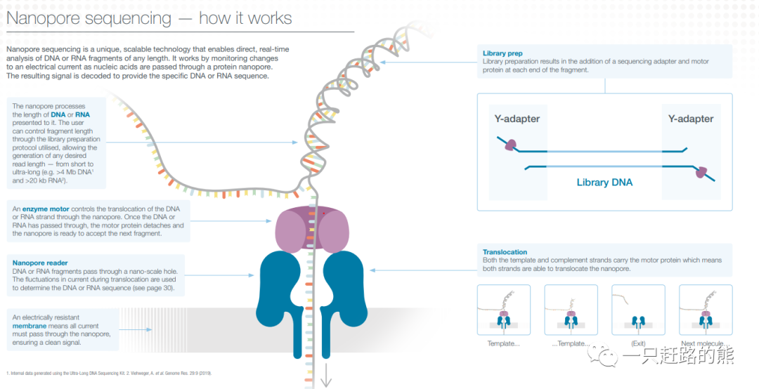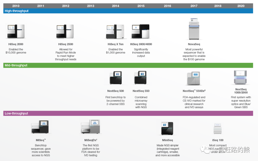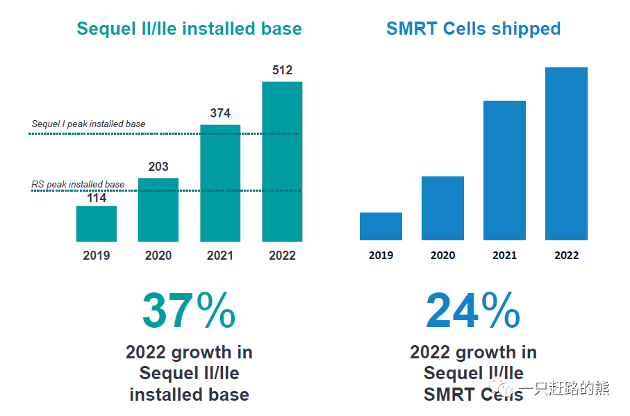 Chapter One 开宗明义 /// 长读长测序及其原理 测序技术发展多代,本质是对四种碱基通过不同类型的信号进行检测。一代测序Sanger法读取的是荧光信号;二代NGS测序中,illumina平台读取的是荧光信号,Ion Torrent测量的是pH值的变化。三代长读长测序的典型平台包括了Pacbio和ONT,Pacbio仍是读取荧光信号,而ONT则是通过电信号判断碱基类型。 长读长测序,顾名思义对应二代NGS技术的短读长测序。与短读长打碎再进行拼凑不同,检测长读长片段对整个待测样本的还原更为简易直观。此外,三代长读长测序无需进行PCR扩增,既节约时间,也可避免扩增带来的偏差。 虽同为长读长技术,Pacbio和ONT技术路线还是存在较大差别。故在代际分类时,也有人将先推出的Pacbio路线称为三代测序,将ONT的纳米孔测序路线称为四代测序。 Pacbio技术路线 测序原理 Pacbio采用的测序方式是边合成边测序,其测序芯片SMRT Cell的技术核心为零模波导孔(zero-mode waveguides, ZMWs),每个ZMW都能够包含一个DNA聚合酶及一条DNA样品链进行单分子测序,并实时检测插入碱基的荧光信号。 ZMW是在硅基材上覆盖的铝箔上加工的直径约100 nm、高度约70nm的圆柱形孔,其直径远小于检测激光的波长(>600nm),因此下方激光只能照亮ZMW底部约2-30nm而不能穿透小孔进入上方溶液区——只有进入这个范围的荧光染料才会被激发,避免了背景干扰。 测序流程 Pacbio的测序流程如下图所示,需要经历DNA打断、建库和测序几个关键环节。PacBio建库所采用的接头是环状单链,其两端分别与待测DNA双链的正负链相连,可得到一个哑铃型的DNA文库。 图源:安诺优达 制备完成的DNA文库加入测序芯片,通过自由扩散进入ZMW(底部锚定了DNA聚合酶)中,被聚合酶捕获,从而将DNA序列锚定在零模波导孔底部。ZMW中同时包含四种被不同荧光基团修饰的dNTP,当DNA与聚合酶形成的复合物被ZMW捕获后,4种不同荧光标记的dNTP通过布朗运动随机进入检测区域并与聚合酶结合,与模板匹配的碱基生成化学键的时间远远长于其他游离态碱基停留的时间,因而可通过荧光信息存在时间的长短区分匹配的碱基与游离碱基,进而通过统计4种荧光信息与时间的关系图对DNA模板序列进行测序。 测序效果 Pacbio现阶段有CLR和HiFi两种测序模式,其中CLR为超长测序模式(插入片段30kb以上),产生的数据是基于单循环测序的结果,一次插入片段只测序一次,准确度和PacBio常规测序保持一致,在85%左右。 Pacbio哑铃文库可以打开变成圆环型,在测序的过程中周而复始进行多次测序,减少随机误差,提高准确率。这种模式被称为HiFi模式,通常片段在10kb-20kb,多次测序后的准确率可以达到Q30级别,即99.9%,相应地,其成本会有所上升。 ONT技术路线 测序原理 与Pacbio相比,ONT的测序方式更为简洁。纳米孔测序将孔蛋白嵌在绝缘的人工膜上,通过记录DNA或RNA链过孔时产生的电流信号对碱基序列进行检测。其技术核心为通道孔蛋白,其中心由一至二个缩窄区形成数纳米的孔道(限制区),仅可容许单链DNA分子穿过。碱基穿过通道时会引起通道电学性质的变化,4种不同碱基理化性质的差异会导至其穿过纳米孔时引起的电学参数变化不同,检测这些变化可得到相应碱基的类型,进而实现测序。 测序流程 纳米孔测序的流程同样包括了DNA片段化、建库和测序几个环节。其建库要点是给待测DNA两端加上接头,接头具有Barcode和解螺旋(马达蛋白)的作用。建库好的DNA样本在马达蛋白的牵引下结合到孔蛋白上,将双链DNA解开成单链后,DNA单链在电场力作用下通过孔道蛋白。DNA分子停留在孔道时,离子通过会带来电流变化,不同的碱基带来的电流变化不同。基于电流变化的频谱,通过识别算法可得到碱基序列。 测序效果 多年来,ONT对测序化学进行不断改进,其flowcell已经有了多个版本的升级,目前最新的kit达到了单链Q20的准确率,通过duplex双链过孔的方法可实现接近Q30级别的准确度。 总体上,Pacbio与ONT的两条技术路线各有优缺。Pacbio准确率高,但读长相对较短、成本较高;纳米孔测序读长更长、更为便捷,但准确性略显不足。与二代测序相比,目前Pacbio和ONT的测序成本均较高。 Chapter Two 珠玉在前 /// illumina的发展史 illumina成立于1998年4月,于2000年上市。上市初的illumina只有105个员工,盈利似乎遥遥无期。经过20多年的发展,如今的illumina已经拥有超过1万名员工,成长为名副其实的行业巨头。 发展历程 研究illumina的发展历程,illumina的发展转折点主要发生在2006-2008年间。在本世纪初,illumina还是一家聚焦在基因芯片领域的企业,直到2006年才实现第一次盈利。同年,illumina做出了其发展路上的关键选择——收购Solexa,正式涉足基因测序领域。 随后几年,illumina利用Solexa的SBS技术已经对数量庞大的微生物、植物、动物和人类基因组进行了测序。新一代测序(NGS)数据产出增加的速度超过了摩尔定律——每年增长一倍以上,基因组测序的成本也从1千万美元迅速降到了1千美元。 现如今,illumina就像是测序领域的Windows系统,是机构眼中不会出错的选择。截止2022年,全球90%以上的测序数据由Illumina的仪器产出,illumina的年收入已经突破45亿美元,俨然是测序行业的绝对标杆。 发展特色 illumina是一家具备鲜明特点的公司,其发展路径被诸多Biotech企业津津乐道。概括illumina的发展历程,不难发现:技术、产品与商业模式相辅相成才能成就一家伟大的公司。 技术 illumina无