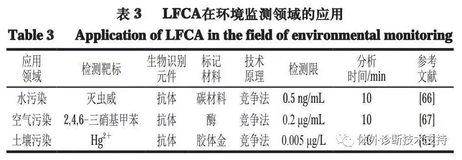 伴随社会生产力发展而来的环境污染和破坏问题已经成为威胁人类生存和发展的重大世界性问题,对此各国环保委员会发起环保联合声明,表示环境污染物的监测为环保的首要环节。LFCA以其快速、可现场检测等优点被广泛应用在环境监测中。 由表3可见,现阶段LFCA在环境监测领域应用范围广但不全面,原因可能有二:其一,环境问题在以前并不严重,后来也并未得到真正重视;其二,环境监测层析试纸开发困难较大、环境样品不易收集处理等。目前应用于环境监测的LFCA试纸条灵敏度可达ng/mL数量级,检测时间短至10 min左右。LFCA可被应用在环境监测领域,为环境中水、空气、土壤等污染的监督管理工作提供便利。但对其他环境污染物的检测开发还需进一步研究和探索,以完善对其的监督和管理。