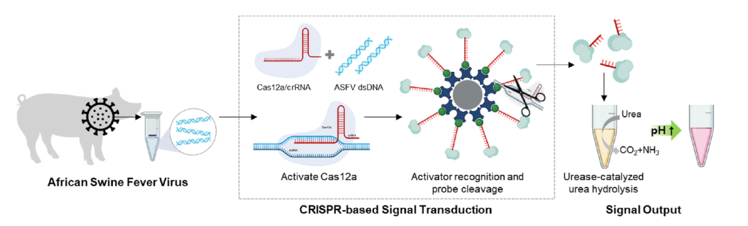 Yang等[9]首次采用LAMP结合CRISPR系统研发了一种ASFV新型检测方法,实现现场便捷快速检测。该研究基于CRISPR/Cas12a酶具有反式剪切活性的特性,通过crRNA的引导识别目的DNA序列后,可以反式切割探针分子发出荧光信号,见图4。LAMP-CRISPR检测方法采用LAMP进行目的序列的扩增富集,既保留了LAMP方法的高敏感性,同时又通过CRISPR的靶向提升了检测方法的特异性。临床样本检测水平与实时荧光定量PCR法相当,在一个反应管中一步完成反应,有效避免了气溶胶污染。作为一种高度灵敏的可视化检测方法,LAMP-CRISPR在基层ASFV的监测防疫中具有巨大潜力。 Jisun Ki等[10]利用CRISPR/Cas12a系统结合脲酶开发了一款比色生物传感系统,用于对ASFV的快速检测。该方法是利用CRISPR-Cas12a在crRNA引导下特异性识别ASFV靶标序列,从而被激发其反式切割活性,切割磁珠锚定脲酶偶联的单链寡核苷酸(urODN),将脲酶从磁珠上释放出来,而后尿素被水解,溶液PH升高,颜色变红,检测原理见图5。若无ASFV靶标存在,则溶液不变色。该方法的优点是无需经过复杂的靶基因扩增过程即可检测出病毒的存在,且该方法操作简单,无需大型、专业的仪器设备。  图5. 基于CRISPR/Cas12a系统下利用脲酶进行ASF检测的示意图2023年3月20日,农业农村部印发《关于做好春季动物疫病防控工作的通知》[11],部署加强非洲猪瘟等重大动物疫病常态化防控和重点人畜共患病源头防控,维护畜牧业生产安全、公共卫生安全和国家生物安全。动物疫病排查和入场采样监测对动物疫病的防控至关重要。ToloBio公司具有自主研发生产的各种CRISPR/Cas蛋白以及国际领先的CRISPR技术,能够实现快速、简便、超敏、高特异的动物疫病病毒检测,助力动物疫病防控,欢迎大家拨打400-032-6070咨询!