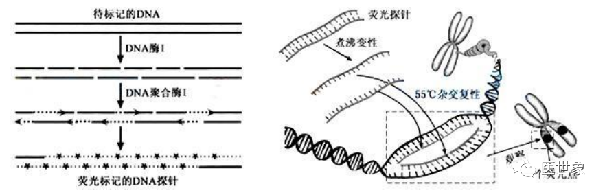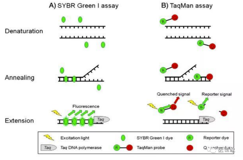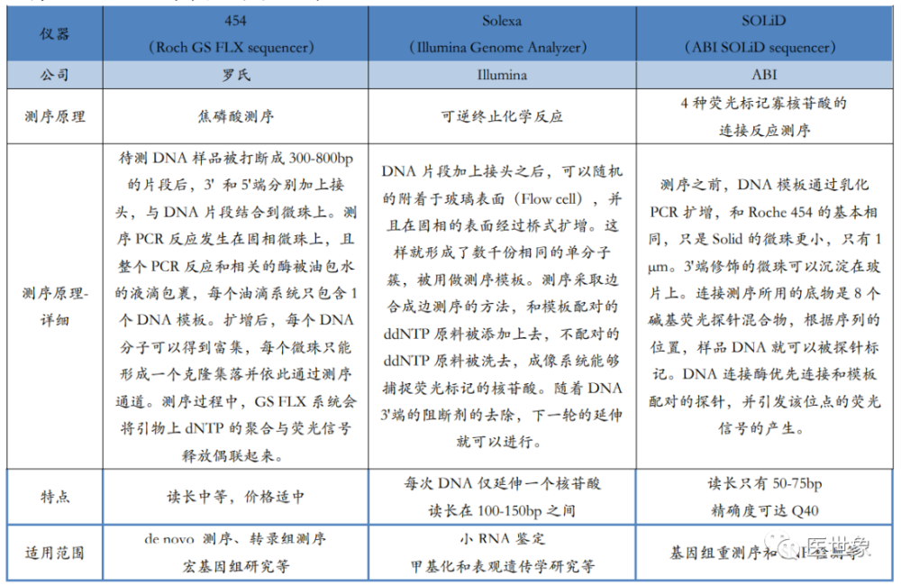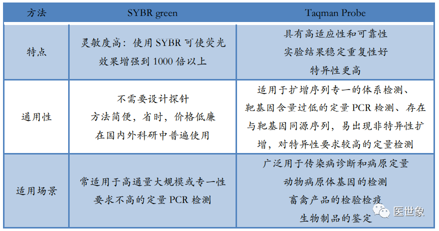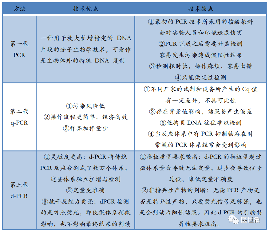 伴随诊断需要通过对样本进行基因测序等分析手段进行药物受体作用位点的确定,目前常用样本类型为组织以及体液。 对组织进行分子分析的技术称为组织活检,具体是指应诊断、治疗的需要,从患者体内切取、钳取或穿刺取出病变组织,对其进行分子分析。 对肿瘤伴随诊断来说,肿瘤组织活检是获取肿瘤 DNA 的金标准。对液体进行分析的技术称为液体活检,具体是指通过对患者的体液中的分析物(CTC、cfDNA、ctDNA 等)进行分子分析,以指导患者的个性化治疗及预后。 组织活检与液体活检技术优缺点对比 从临床应用上看,组织活检与液体活检各有优劣。虽然目前基于液体活检的肿瘤伴随诊断近年来处于蓬勃发展之中,但并非意味着其已经能取代组织活检技术,两者合作互补或许能大大提高诊断效率,减少过度治疗。随着液体活检技术不断发展,未来基于液体活检的肿瘤伴随诊断或将进一步替代组织活检技术,成为伴随诊断检测的主力军。 伴随诊断主要基因测序方法 伴随诊断是通过基因测序等手段进行药物受体作用位点的确定,随着靶向药的应用推广,伴随诊断逐步确立起指导治疗的重要地位。在伴随诊断所用检测技术中,PCR、NGS、FISH 是目前市场上应用最广泛的技术,其各有优劣,在各大伴随诊断企业中均有分布。 (一)PCR PCR(聚合酶链式反应)是一种用于放大扩增特定 DNA 片段的分子生物学技术,可以看作是生物体外的特殊 DNA 复制,其最大特点是能将微量的 DNA 大幅增加。在存在DNA模板、引物、dNTPs、适当缓冲液 (Mg2+) 的反应混合物中,在热稳定 DNA 聚合酶的催化下,对一对寡核苷酸引物所界定的核酸片段进行扩增,这种扩增是以模板 DNA与引物之间的变性、退火、延伸三步反应为一个周期,循环进行,使目标 DNA 片段得以扩增。 普通 PCR 原理图 最初的普通 PCR 技术只能通过对靶基因进行扩增,然后采用琼脂糖凝胶电泳对产物进行分析,实现简单的定性分析,这是第一代 PCR。鉴于(1)第一代 PCR 采用的核酸燃料对实验人员及环境造成较大伤害,(2)PCR 完成之后开盖检测易污染造成假阳性结果,(3)检测耗时长且操作麻烦易出错及(4)只能做定性检测,二代 PCR 得以发展并成为目前国内 PCR 技术主流。第二代 PCR 就是荧光定量 PCR 技术(Real-Time PCR),也叫做 qPCR, 是指通过应用荧光染料或荧光标记的特异性探针(如 Taqman Probe),在 PCR 反应体系中加入荧光基团对聚合酶链反应产物进行标记跟踪,实时监控反应过程,结合软件对荧光信号进行分析,实现基因检测的定性和定量分析。qPCR 常用于传染病病原体检测,疾病耐药基因研究,药物疗效考核,遗传疾病诊断。随着反应循环次数的增加,被扩增目的基因片段呈指数增长,通过实时检测对应的随扩增而变化荧光信号强度,求得 Ct 值,利用已知模板浓度的标准品作对照,即可得出待测标本目的基因数。由于 rPCR 定量过程通过 Ct 值间接反映,因此称为第二代 PCR。 实时荧光定量 PCR 原理图 应用荧光染料:SYBR green:在 PCR 反应体系中,加入过量 SYBR 荧光染料,SYBR 荧光染料特异性地掺入 DNA 双链后,发射荧光信号,而不掺入链中的 SYBR 染料分子不会发射任何荧光信号,从而保证荧光信号的增加与 PCR 产物的增加完全同步。 应用特异标记探针:Taqman Probe:PCR 扩增时在加入一对引物的同时加入一个特异性的荧光探针,该探针为一寡核苷酸,两端分别标记一个报告荧光基团和一个淬灭荧光基团。探针完整时,报告基团发射的荧光信号被淬灭基团吸收;PCR 扩增时,Taq酶的 5’-3’外切酶活性将探针酶切降解,使报告荧光基团和淬灭荧光基团分离,从而荧光监测系统可接收到荧光信号,即每扩增一条 DNA 链,就有一个荧光分子形成,实现了荧光信号的累积与 PCR 产物形成完全同步。 荧光染料 VS 荧光探针 随着 PCR 系统的进一步发展已经对检测,一种具备较高灵敏度和特异性的数字PCR 技术开始被广泛应用于肿瘤临床检测和科学研究中。数字PCR(Digitai PCR,dPCR)是一种新兴的核酸检测技术,通过将每个核酸分子分配到一个独立的空间内,避免选择性扩增对扩增结果的干扰,可实现核酸模板绝对定量、稀有突变检测、拷贝数变异、DNA 甲基化、基因重排等检测功能。由于数字 PCR 可以实现直接定量分析,被称为第三代 PCR。 数字 PCR 原理图 通过稀释样品 DNA 到对应的检测孔中,经过 PCR 扩增之后,向每个孔里加入特异性荧光探针与产物杂交,然后直接计数样本中突变型和野生型等位子的数量。dPCR 常用于大量正常细胞群中检测少数含突变的细胞,主要应用于突变分析、等位基因缺失、混杂 DNA 的癌症检测等等。 三代 PCR 的技术优劣 (二)NGS NGS(高通量测序技术)是指通过模板 DNA 分子的化学修饰,将其锚定在纳米孔或微载体芯片,利用碱基互补配对原理,在 DNA 聚合酶链反应或 DNA 连接酶反应过程中,通过采集荧光标记信号或化学反应信号,实现碱基序列的解读,一次性可完成几十万至上百万序列的测定。 NGS 是基于 PCR 和基因芯片发展而来的 DNA 测序技术。一代测序为合成终止测序,而二代测序开创性的引入了可逆终止末端,从而实现边合成边测序。二代测序在 DNA复制过程中通过捕捉新添加的碱基所携带的特殊标记(一般为荧光分子标记)来确定DNA 的序列。 目前高通量测序的主要平台代表有罗氏公司(Roche)的 454 测序仪(Roch GS FLX sequencer),Illumina 公司的 Solexa 基因组分析仪(Illumina Genome Analyzer)和 ABI的
