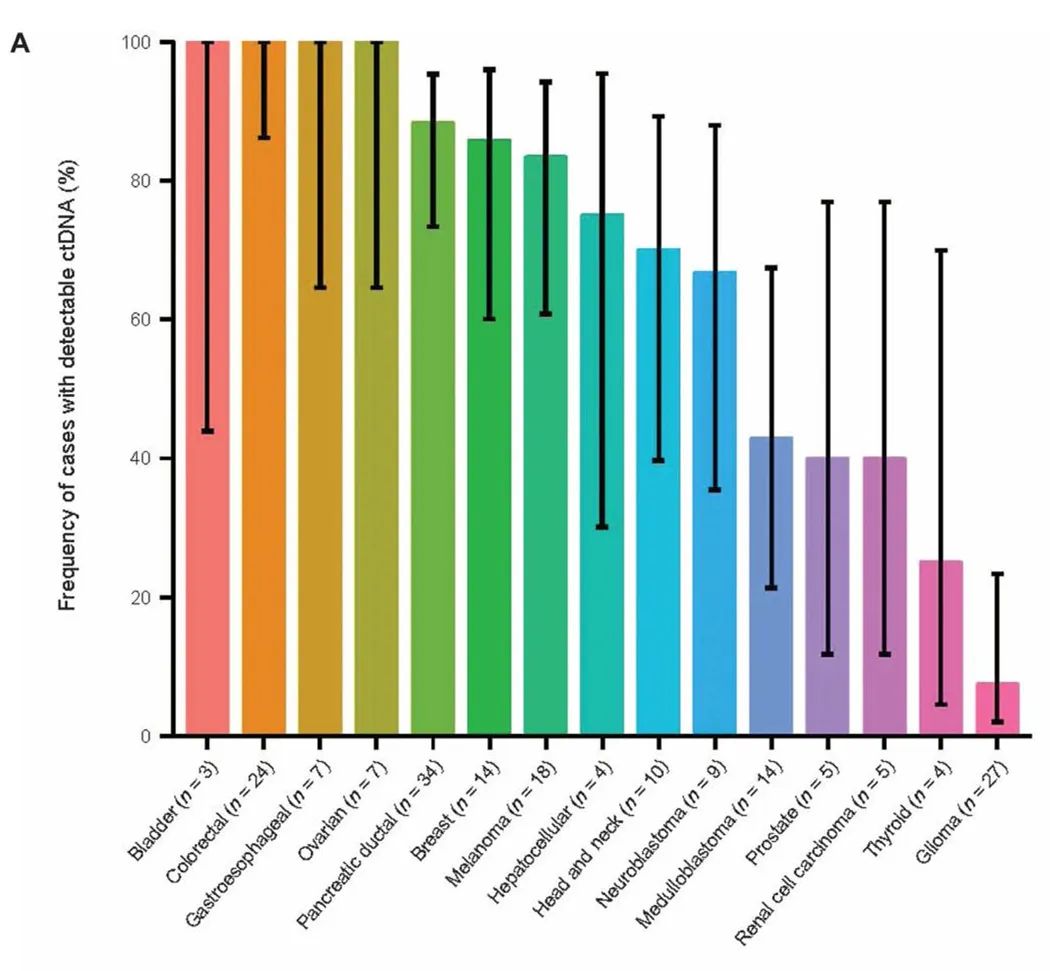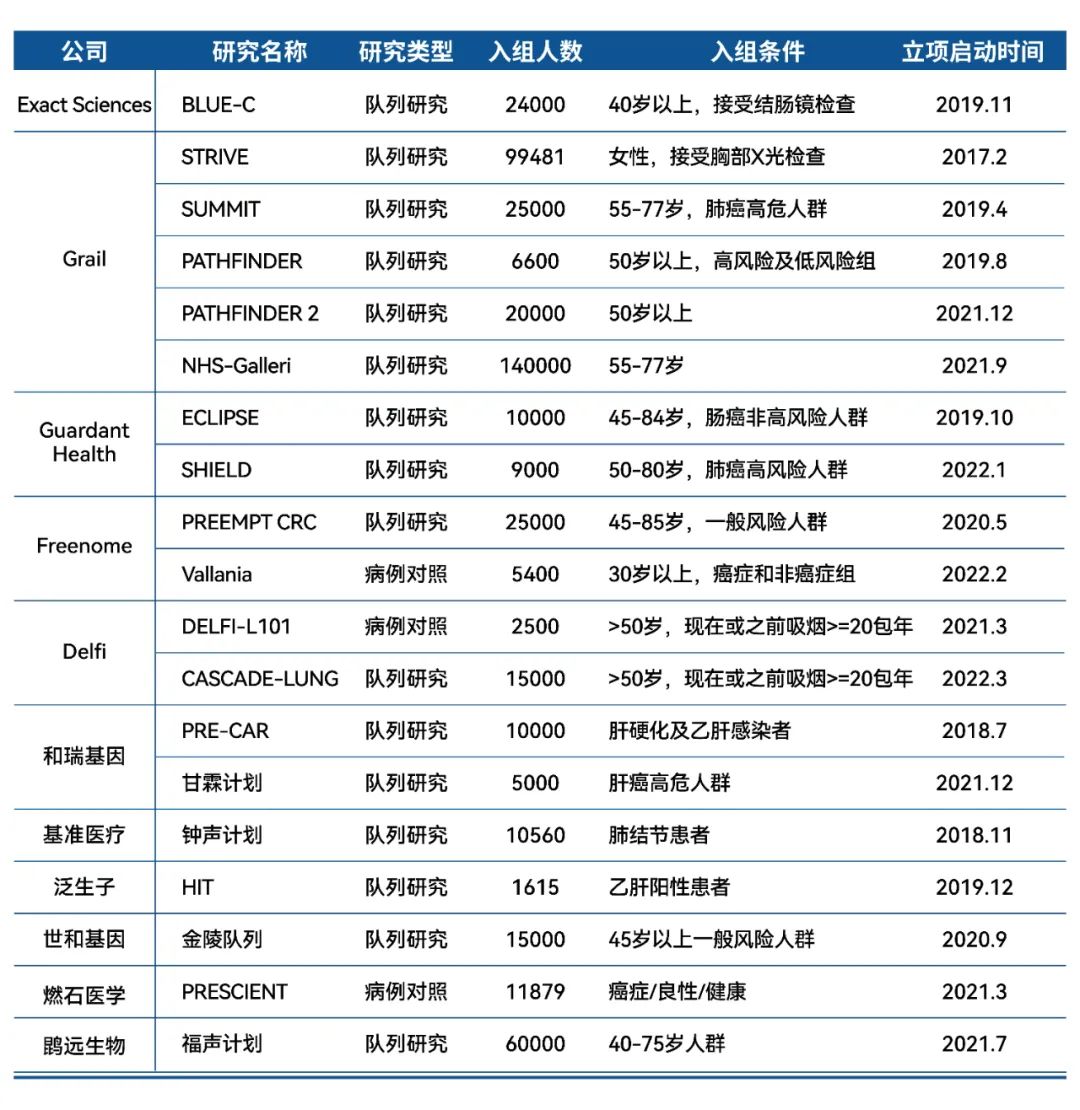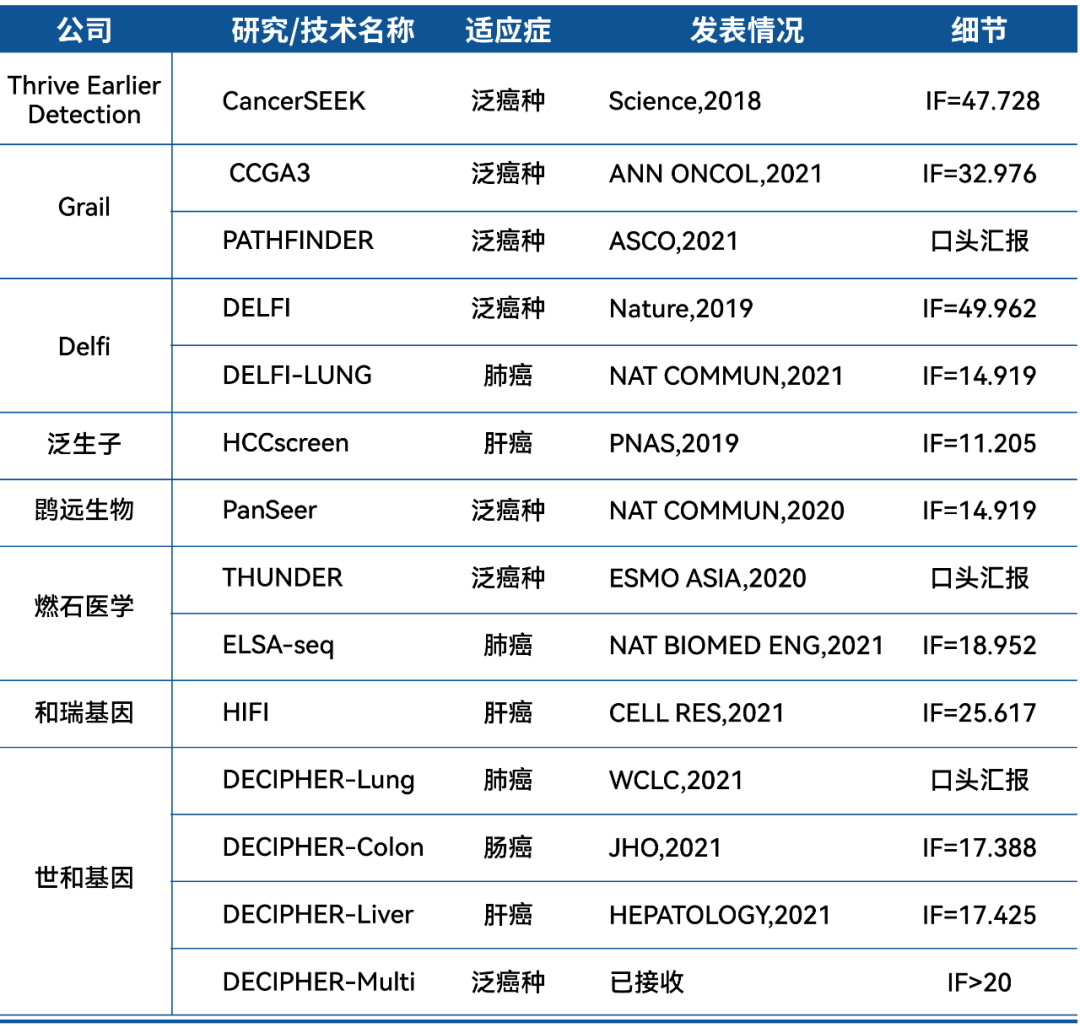 Biotech行业一直有句俗话,“只有政策下的行业,没有行业下的政策”。在这个资本市场的寒冬,利好政策的推出像冬天里的一团火苗,重新给予行业一些温暖和信心。 国家发展改革委印发《“十四五”生物经济发展规划》[1](以下简称《规划》),这是我国首部生物经济五年规划,明确提出了生物经济发展的阶段性目标和重点发展领域。《规划》指出要 “强化企业创新主体地位,发展壮大新型创新力量,要通过“助力疾病早期预防,提升疾病诊断能力,提高临床医疗水平”来“推动医疗健康产业发展”。“加快发展高通量基因测序技术,以高通量基因测序技术为主,重点开展肿瘤早期筛查”被首次提高到了“十四五”规划的高度。配合癌症筛查和早诊早治被列入《健康中国行动2022年工作要点》[2],肿瘤早筛似乎成为了乌云笼罩下的一道金边,蕴含了生物科技行业的光热与希望。 表1. USPSTF推荐的癌症筛查方式和PPV 由于传统肿瘤筛查手段中存在的多种局限性,临床迫切需要一些敏感性/特异性更高且更便于操作的早筛技术。液体活检技术作为一种非侵入性的新型检测技术,在肿瘤早筛方面具有巨大的应用潜力。 液体活检通过血液、唾液、尿液等体液样本对肿瘤信号进行检测分析,与传统组织活检相比,具有无创、实时动态监测、克服肿瘤异质性等优势[6],曾被MIT《科技评论》杂志评选为“2015年十大突破技术之一”,还被世界经济论坛与《科学美国人》杂志联合评选为“2017年度全球十大创新技术之首”。 这种快速、简便、无创的检测技术在当时被认为是未来极具潜力的肿瘤早筛早诊工具。现在,未来已至,随着国内外多家Biotech公司积极布局肿瘤早筛赛道,液体活检在肿瘤早筛中的应用研究正在如火如荼地开展当中。 图1. 乳腺癌中不同分期下血液cfDNA中肿瘤来源ctDNA含量[7] 液体活检的肿瘤标志物主要包括基因组、表观遗传学、转录组、微生物组、蛋白组和代谢组等层面。肿瘤标志物在ctDNA层面的特征主要包括点突变、片段化、拷贝数变异、甲基化等维度。 1 突变特征 2 甲基化特征 3 片段组学特征 拷贝数变异一般指长度为1kb以上的基因组大片段的拷贝数增加或减少,包括拷贝数变化(染色体臂的增加和丢失)以及由易位、扩增或缺失引起的重排。基因组拷贝数的异常通常会导至基因表达的改变,影响基因的正常功能,如拷贝数增加会引起ERBB2、MET等原癌基因的过表达,拷贝数缺失会导至TP53、RB1、BRCA1等抑癌基因的失活,进而导至细胞癌变[14]。近年来,人们发现血浆DNA断裂并不是一个随机的过程。血浆cfDNA通常有一个显著的167bp的峰值分布,这主要与cfDNA形成机制有关:基因组DNA大约每147bp盘绕一个核小体,另外20bpDNA作为2个核小体之间的连接,在细胞凋亡的时候,DNA以每167bp进行剪切并被释放到血液中。有研究发现,癌症患者的血浆中cfDNA峰值分布更短,且与患者分期有一定联系,尤其对于高ctDNA水平的癌种:包括乳腺癌、黑色素瘤、卵巢癌、肺癌等患者的cfDNA片段显著更短[16]。由于血液中cfDNA的主要形式是受单个核小体保护的DNA,所以与甲基化模式类似,核小体定位变化也伴随着基因表达模式的转变,其在转录调控、DNA复制和修复等多种细胞过程及肿瘤发生发展中起着重要作用。因此肿瘤具有特有的核小体印记评分。核小体定位因细胞类型而异,因此也包含着cfDNA组织起源信息[13]。末端基序(Motif)被定义为血浆DNA末端的几个核苷酸,癌与非癌具有不同偏好的末端切割模式[15]。 综上所述,片段组学依托于WGS(Whole Genome Sequencing, 全基因组测序),靶点覆盖于全基因组学层面。 表2. 国内外各公司早筛技术路径 1 甲基化路径 DNA甲基化是肿瘤早筛中运用最成熟的特征之一,多家公司都采用了甲基化的技术路线,包括国内的燃石医学、泛生子、鹍远生物、基准医疗等公司,也包括泛癌种早筛技术的龙头老大:美国癌症早筛公司Grail。 Grail为了在自然人群中实现早筛,斥巨资启动了大型临床试验“循环游离基因组图谱研究”(Circulating Cell-free Genome Atlas,CCGA)。CCGA前瞻性多中心研究计划纳入超过15000例受试者(70%癌症患者,30%非癌症患者)并追踪5年,分析受试者cfDNA中的突变、拷贝数变异(CNV)、甲基化等基因组特征。2020年3月,Grail公布的数据表明,cfDNA靶向甲基化液体活检分析方法可区分多阶段的50多种癌症,包括缺乏筛查指南的高死亡率癌症和早期癌症,特异性>99%,单一假阳性率<1%。该检测对I–III期癌症的敏感性为43.9%,I–IV期敏感性为54.9%。在检测到癌症信号时,该检测还能以93%的准确度定位癌症的组织起源[17]。CCGA-3最新数据显示,在总体人群中,基于靶向甲基化技术的肿瘤早筛模型检测特异性高达99.5%,灵敏度为51.5%,肿瘤信号定位准确率为88.7%[11]。对于51.5%的灵敏度,一个问题是:在确保特异性的同时,如何进一步提升早期癌症的灵敏度? 2 多组学路径 “多组学”是肿瘤早筛,甚至肿瘤检测行业最热门的技术词汇之一。恶性肿瘤的发生涉及基因、表观遗传、转录组、微生物、蛋白和代谢等多个不同层次和不同维度的病理过程。如果只对单一组学的特征进行分析,会给靶点的筛选带来较大的局限性。而多组学特征整合分析一方面能够相互印证,增强检测结果的说服力;另一方面也能够多维度、全方位地捕捉癌症早期信号,提高灵敏度。 在多组学泛癌种方面,2018年Thrive Earlier Detection公司在Science