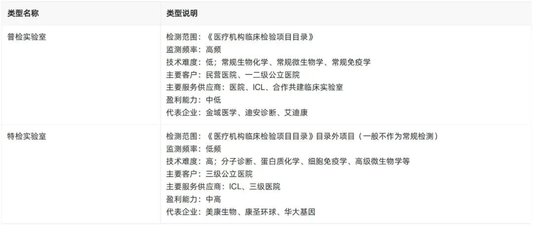 IVD对我而言是意外也是缘分 近段时间,时不时有做医疗投资的朋友跟我说,虽然我不是做金融行业的,但是我的文章经常是带有金融属性的。 其实我对金融的兴趣由来已久,最早在高三的时候,从第一次看到一篇介绍巴菲特的文章开始,就对金融产生了浓厚的兴趣。那之后我陆续看过几十本金融相关书籍,大部分是在大一的时候看的。 股票、外汇、期货等相关金融书籍,或多或少我都曾涉猎过,但是最感兴趣的还是股市,我开股票账户也挺早的,大一的时候就有了自己的股票账户,随即就买了几只股票,所以虽然我炒股很少,但是股龄已经有14年了。 我和金融、IT、电商这三个行业都有很深的缘分,金融是兴趣,IT是我大学最主要的专业课程,我大学学的是信息管理,就是计算机和管理学,我们学校是偏计算机的。而电商,我曾有过八年的创业经历。 经常有朋友问,为什么我没有从事IT或者金融相关行业?因为我大学毕业那会儿,一心只想创业,手上又没钱。IT和金融的创业门槛都很高,最后迫于无奈,我选择了门槛相对低的电商领域进行创业,而且做的还是电商领域门槛相对较低的女装类目。 我经常也会思考,我的那些基于兴趣或者缘分的学习经历、创业经历,对于我未来的人生事业算一种积累吗? 2008年年初的时候,我为自己的人生提出了金融、新能源、IT三个方向,目前来看,当时的我还是很有预见性的,只可惜我的这些预见似乎并没有给我的未来铺平道路。 后来创业做电商,我觉得我是在“曲线救国”,早晚还是会回到我的IT主航道的,没想到还没熬到回归IT主航道,我就已经转型了IVD。这个选择对我而言很难很难,所以我其实犹豫过很多年。 第三方医学检验实验室对我而言陌生又熟悉 第三方医学检验实验室也叫独立医学实验室(Independent Clinical Laboratory,ICL),按理说这应该是我比较熟悉的一类医疗机构,因为我在第三方医学检验实验室工作过。 我前面写过的金域医学、迪安诊断、达安基因也都算得上第三方医检实验室中的代表,ICL龙头企业当中,目前可能也就艾迪康我还没有系统写过,艾迪康也是一个挺有话题性的ICL企业,有过“三闯”IPO的经历,最近一次的IPO申请已经通过了,应该也快上市了。 不过我发现,虽然同样是第三方医学检验实验室,大家的认知中金域、迪安、艾迪康似乎更符合ICL的形象,像华大基因、贝瑞和康虽然核心业务也都包含ICL,但很多人讨论ICL的时候,容易忽视它们的存在。可能达安、华大做特检居多,特检毕竟是近些年才兴起的。 这两天在学习ICL的过程中,莫名觉得有点吃力,我以为这是我熟悉的行业,但可能我熟悉的只是一个个企业名字,还有基本的市场格局。对于ICL行业的发展逻辑,在写这篇文章之前,其实我并不了解。 临床诊断检测简介 临床诊断检测是在实验室进行的医疗检测,旨在提供有关某一人士健康状况的资料。这一资料可协助医生针对病患护理作出精确及个人化的诊断决策。 根据Frost & Sullivan的资料,大约70%至80%的临床决策乃以某些形式的实验室检测为基础。此外,临床检测亦能够协助制药及生物技术公司研发新药及疫苗,支持私营企业雇主检测其雇员的酒精及药物滥用情况,并帮助保险公司评估与申请人健康状况有关的风险。 临床诊断检测通常由三类提供商进行,即医院实验室、第三方医学检验实验室及其他(如医生办公室、疗养院及门诊手术中心),其中,就收益及检测量计,医院实验室为最大的医学检验服务提供商。 医院实验室通常仅为其自身住院病人提供检测,而另一方面,ICL独立于医院,自大量医院及研究机构接收样本进行分析。相较于医院实验室,ICL的规模通常较大。ICL通常拥有更先进的设备及技术上更训练有素的实验室人员,使得样本能够以更具成本效益的方式进行专业检测及大量测试。 根据Frost & Sullivan的资料,医院实验室的测试目录通常拥有约800项测试项目,大部分为普检项目,可满足一家医院就诊患者的基本诊断需求,而ICL通常能够提供检测1,000多项测试项目,包括涵盖专业特检在内的各种检测类型。 像金域医学这样的头部ICL企业,能提供的检测项目就更多了,根据金域医学2022年年报显示,金域医学拥有检验技术79类,2022年新开发项目超过600项,在推动产品持续升级迭代的同时,对外提供服务项目总数超过3600项。 迪安诊断提供3000余项医学检测项目,包括分子诊断、病理诊断、生化发光检验、免疫学检验、理化质谱检验及其他综合检验等从常规到高精尖的检测项目。2022年,迪安诊断新开检测项目270个。 检测项目数据上,表现最好的没想到是艾迪康,截止到2022年年底,艾迪康的检测组合包括4000多种医疗诊断检测,其中包括1700多种普检及2300多种特检。 第三方医学检验实验室行业定义 独立医学实验室(Independent Clinical Laboratory)简称ICL,也称第三方医学实验室。一般来说是指获得了卫生行政部门许可行的、具有独立法人资格的、专业从事医学检测的服务性医疗机构。 第三方医学检验实验室行业分类 第三方医学检验实验室行业特征 行业发展和企业普及便捷。由于ICL业务标准化,在各地开展业务普及较为容易。实验样本的生理特点决定了检验必须快速完成,考虑到单个实验室服务半径相对较小,ICL公司需要达到足够广阔的业务布局以确保辐射范围,实验室的数量和覆盖范围决定了公司的业务渗透率。以ICL行业巨头为例,LabCorp和Que