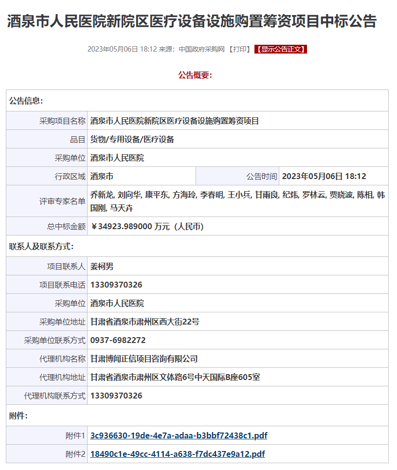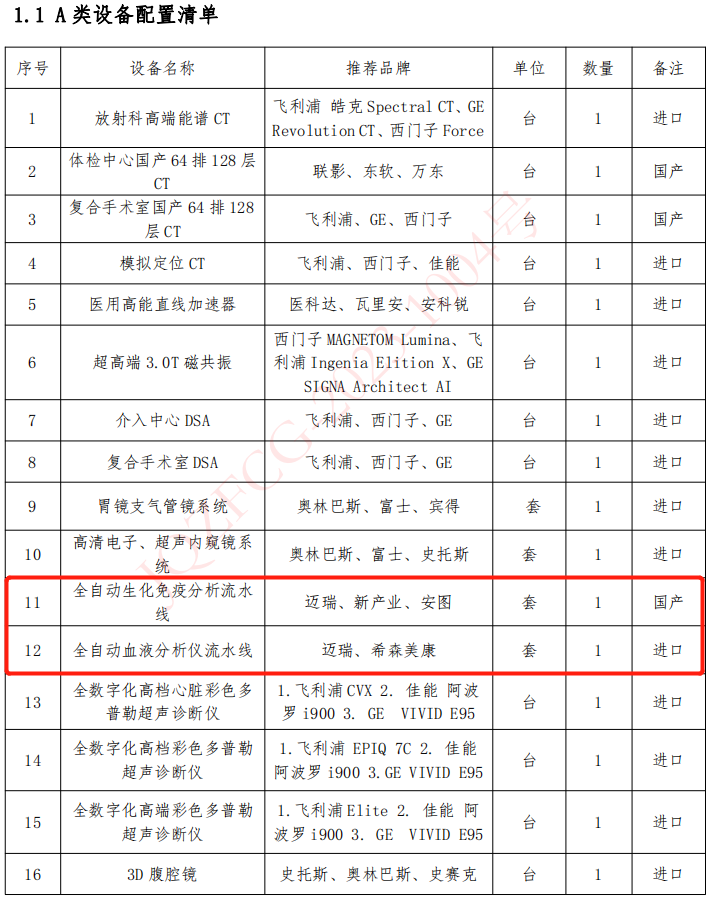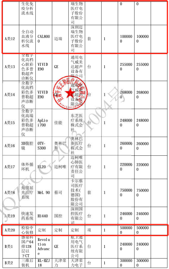 2023年5月6日,中国政府采购网发布信息,酒泉市人民医院新院区医疗设备设施购置筹资项目中标公告。其中标金额高达3.49亿! 一、项目编号 JQZFCG-2023-1004号 二、项目名称 酒泉市人民医院新院区医疗设备设施购置筹资项目 三、中标(成交)信息 供应商名称:甘肃平安正和医疗科技有限公司、平安点创国际融资租赁有限公司 中标金额(万元):34923.989万元 六、代理服务收费标准及金额 收费标准:按中华人民共和国国家计划委员会发布的《招标代理服务收费管理暂行办法》(计价格[2002]1980号),在标准取费的基础上下浮10%收取。 收费金额:49.37万元 根据公布的信息,此次招标中标金额3.49亿元,中标服务费达到49.37万元,创历史新高。 根据招标文件,酒泉市人民医院新院区医疗设备购置为二次招标 一、项目基本情况: 项目编号:JQZFCG-2023-1004号 项目名称:酒泉市人民医院新院区医疗设备设施购置筹资项目(二次) 预算金额:349247430元(人民币) 大写:叁亿肆仟玖佰贰拾肆万柒仟肆佰叁拾元整人民币 最高限价:349247430元(人民币) 采购需求:酒泉市人民医院新院区设备配置、总务后勤物资配置及安防设备配置(具体内容详见招标内容) 合同履行期限:详见《招标文件》 本项目接受联合体投标: 本项目接受联合体投标,以联合体投标的,组成联合体的成员数量上限为2家。联合体投标的,鼓励联合体由设备供应商和融资公司组成。联合体各方在同一招标项目中以自己名义单独投标或者参加其他联合体投标的,相关投标均无效。(具体要求详见招标文件) 酒泉市人民医院新院区计划2023年8月开始搬迁。新院区所需医疗设备、总务后勤设备(物资)、安防设备等需同步配置到位。为了保证新院区如期投入运行,为人民群众提供更优质高效的医疗服务,现通过招标方式确定设备供应商,向医院提供预算总价为34924.743万元的医疗设备、总务后勤设备(物资)及安防设备等。 鉴于项目所需资金较大,鼓励融资公司参与项目投标,投标人可由联合体(设备供应商牵头并联合融资公司组成联合体)参与本项目投标。医院分8年32期向中标人等额支付项目资金,医院不承担中标人项目资金产生的利息及相关费用。 1.投标人在制作投标文件第 7 项“招标内容及技术规格偏离表”时,内容填写为“具体内容详见附表 7.1-7.5”。 备注: (1)配置清单内推荐的品牌,仅作为投标参考,不作为中标条件。 (2)备注栏注明“国产”的产品不接受投标人选用进口产品参与投标; 注明“进口”的产品允许投标人选用进口产品参与投标,但不排斥国内产品。 (3)进口产品是指通过海关验放进入中国境内且产自关境外的产品。即所谓进口产品是指制造过程均在国外,如果产品在国内组装,其中的零部件(包括核心部件)是进口产品,则应当视为非进口产品。采用“进口”的产品优先采购向我国企业转让技术、与我国企业签订消化吸收再创新方案的供应商的进口产品,相关内容以财库〔2007〕119 号文和财办库〔2008〕248 号文的相关规定为准。 针对生化免疫流水线: 1、样本进样区 架式进样单元一套,进样单元容量≥400管,进样单元纯进样处理速度≥750样本/小时; 需含优先进样区,处理速度≥600样本/小时; 架式进样单元能容纳不同规格的样本管进样,包括75mm&100mm样本管; 2、去盖单元 去盖单元一套,能对识别后的样本自动去盖,能去除多种类型的试管盖; 每个去盖单元去盖速度≥600样本/小时; 3、离心单元 配置低温离心机一台,每台离心机速度≥280管/小时; 离心机机械臂从轨道上单次抓取样品管≥5管; 具有智能自动平衡功能; 4、出样单元 出样单元一套,每个出样单元容量≥400管; 出样单元分类及出样速度≥750管/小时,可连续出样; 5、轨道传输系统 ◆主传输轨道为磁悬浮轨道,样品管在轨道上单管传输; 生化模块:最小检测模块光学速度≥2000测试/小时,总光学速度≥4000测试/小时;在线离子速度≥1200测试/小时; 发光模块:单机或单模块最大测试速度≥500测试/小时,总测试速度≥1000 测试/小时; 生化免疫流水线迈瑞中标,M6000,中标金额450万元;血液分析流水线迈瑞中标,CAL8000,中标金额100万;检验科装修,中标金额500万元。 由于数量较多,不一一列举,但从粗略统计来看,迈瑞是此次的大赢家,统计表来看,迈瑞中标38项,总金额4000万以上。 从中标来看,此次招标,大型设备依然被进口厂家垄断,就检验设备来看,国产占据主流,其中流水线和部分单机,基本能实现国产替代。 本项目详细中标文件 请扫描下方二维码查看 |