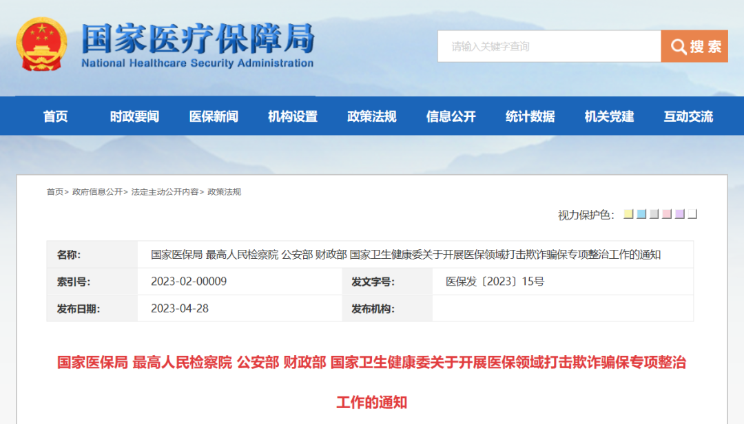 4月28日,国家医保局官网发布《国家医保局、最高人民检察院、公安部、财政部、国家卫生健康委关于开展医保领域打击欺诈骗保专项整治工作的通知》,《通知》正式印发并要求执行《2023年医保领域打击欺诈骗保专项整治工作方案》。