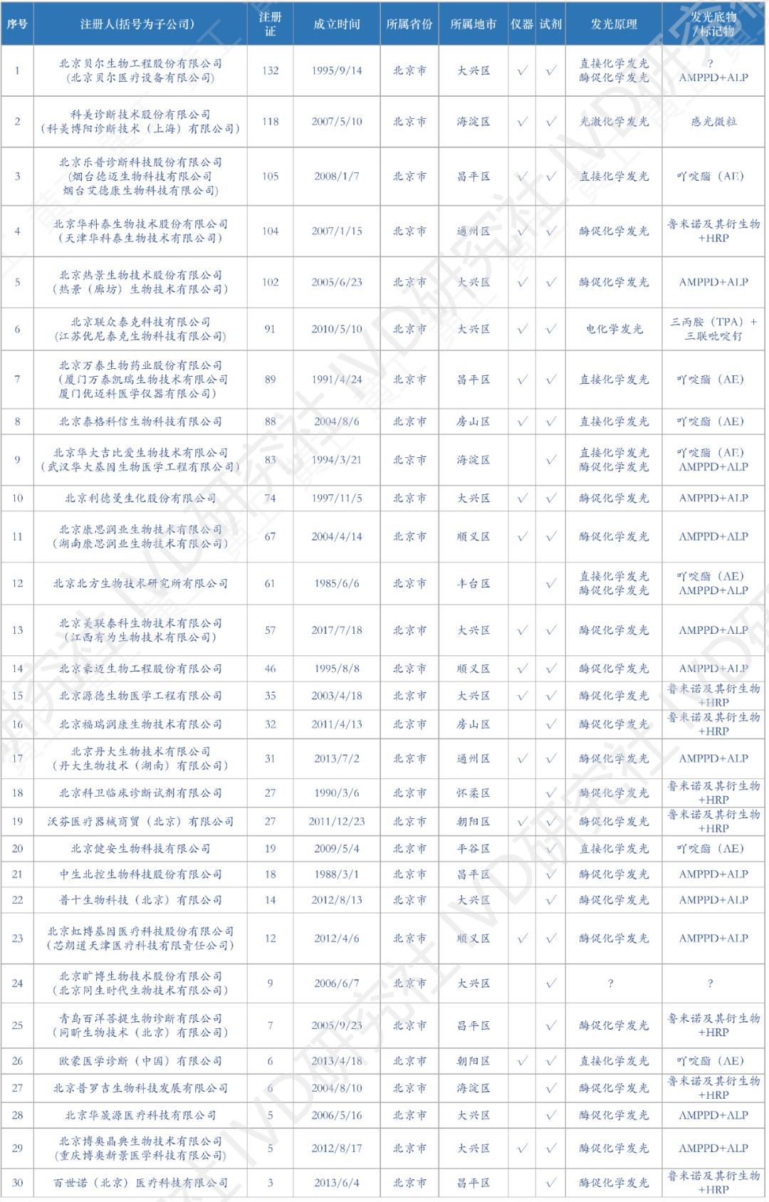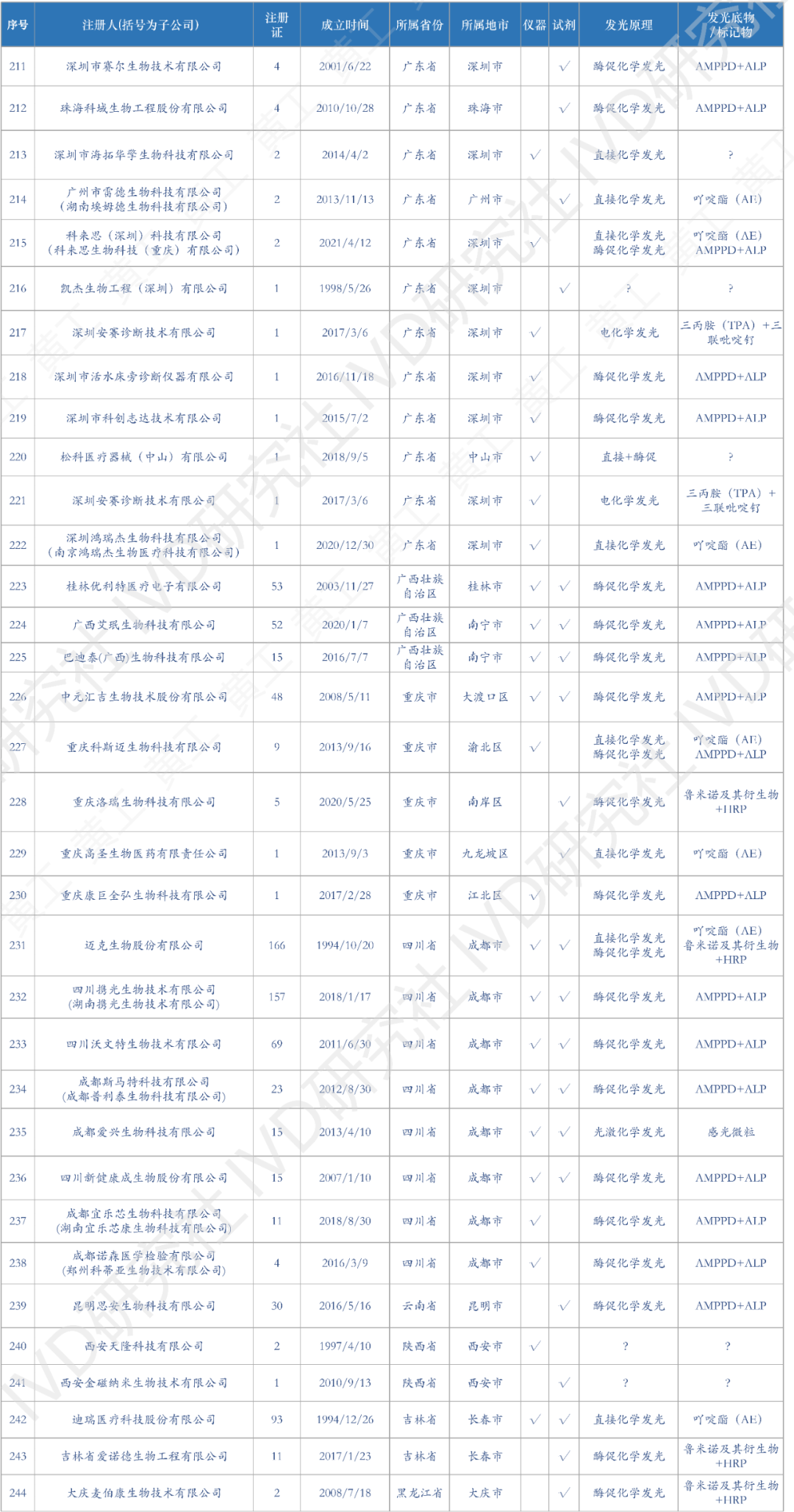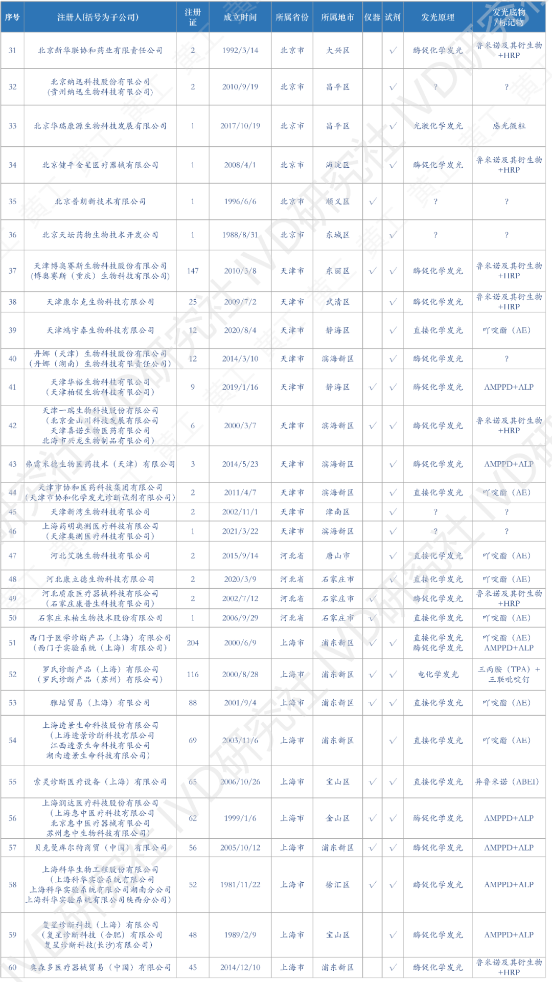 花了一个多月时间,终于把国内化学发光有效注册证数据,全部整理、清洗好了。到2022年12月31日,国产化学发光注册证共6968张;到2023年4月5日,进口化学发光注册证642张。两者加总,目前国内化学发光注册证,大约7600张,包括仪器、试剂、质控品、校准品等。去年统计的国产注册证,到2023Q1可能有增有减,但数据差异不会太大也不影响本文论述。这7600张注册证,登录国家药监局数据库,医疗器械板块,输入“化学发光”整理可得。(↑:目前国内化学发光有效注册证数据,国产+进口,总计7600条)基于上述数据,梳理出国内市场,化学发光相关企业共309家。这309家企业,包括子公司在内,很多不仅从事化学发光业务,也有IVD其他板块的,但都和化学发光有关,就一并整理了。另外,还对这309家企业,成立时间、所属省区市、母公司(控股公司)、业务包含仪器/试剂、发光体系等重要内容,做了进一步的分析整理,基于此表,可一览全国化学发光版图。(需要上表的朋友,可加入文末黄工的知识星球,有很多干货资料供下载,有技术群供交流)
