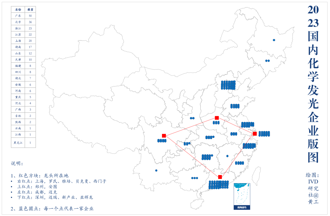 上图,我们能看到,国内化学发光生产企业,主要分布于珠三角、长三角、京津冀一带。具体讲,分布于广东省(深圳、广州),北京市(大兴),浙江省(宁波、杭州),上海市(浦东),江苏省(苏州、南京)等省市。外资4大巨头(罗雅贝西),中国总部注册地在上海。国产5大龙头(迈瑞、新产业、安图、迈克、亚辉龙),分布于深圳、郑州、成都。这9家企业地点连线,在地图上构成了一个菱形。也是国内4大经济增长极。经合并子公司,保留有50%以上控股权的母公司,国内大约有244家,有化学发光业务。这个数据,包含外资企业。具体看下方8张表格,一览化学发光企业档案。排列顺序:华北-华东-华中-华南-西南-西北,注册证数多少。注册证数,统计时间截止2022/12/31,到今天有增减,请注意!有关化学发光仪器型号,这里就不列举了,感兴趣可以看看,黄工另一篇文章《一文概览:化学发光免疫分析仪》,目前累计阅读量为3.2万+。