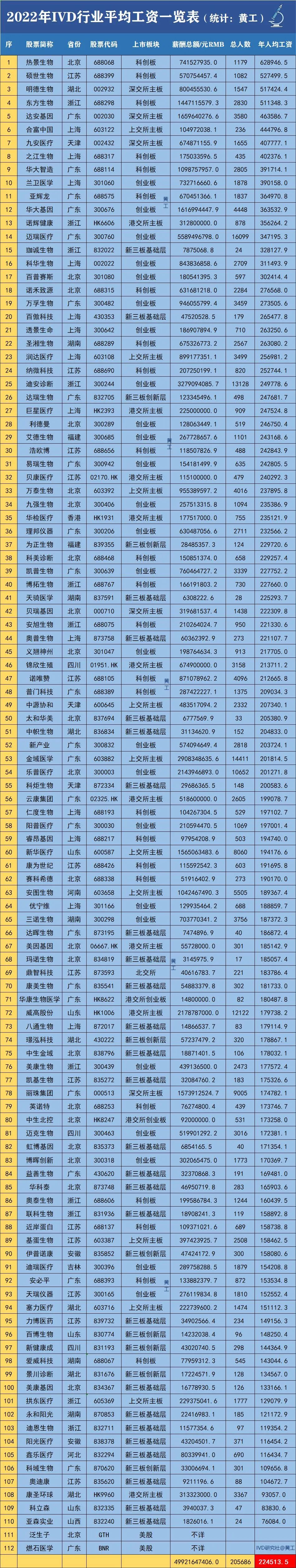 5月9日,国家统计局发布2022年平均工资有关数据。网上搜索,相关新闻不胜枚举。统计局官网,也发了数据报表和注释。平均工资是一个重要的民生指标,与百姓的生活密切相关,受到广泛关注。国家统计的数据,主要用于宏观政策、市场经济、社会保障等方面研究和调控。太宏观,于个人而言意义不大。“工资是工资劳动者收入的主要来源,是企业生产成本的重要组成部分。工资数据,一般有3个作用。一,用于劳动力用工成本核算和市场竞争力的比较;二,反映国民收入初次分配基本状况和变化;三,是征缴和支付各项社会保险的重要依据。工资包括,计时工资、计件工资、奖金、津贴和补贴、加班加点工资、特殊情况下支付的工资。而平均工资,是指平均每一个工资劳动者在一定时期内的工资水平。”说回IVD行业。黄工检索公众号文章,发现这些年来,有关IVD行业平均工资信息,还没有。对每一个IVD从业者来讲,这个数据更有参考意义。行业年平均工资,则应是行业内所有从业者,在一个自然年内,税前工资总额的平均数。这个数据,大概率是难以统计到的。怎么办呢?只有去看看,业内的上市公司,只有他们披露工资总额、员工人数等信息,基于此推测全行业情况。统计学上,有个概念叫抽样调查,分为概率抽样和非概率抽样。抽样调查,一般指概率抽样,是基于随机原则和概率论,从总体样本随机抽取一部分进行调查,以此推断总体情况。而非概率抽样,是根据自己方便和主观判断抽取样本,不能以此推及总体,但能反映总体的情况和特点,有一定参考意义。黄工本次的统计,正是后者。受迫于现实条件,只能找公开资料,进行整理、统计、分析。样本包括110家上市(挂牌)企业。它们的主营业务,核心都与IVD强相关。产品包括:生物原料(抗原、抗体、酶等),零部件(电机等),仪器、试剂、实验室和采样耗材器具,检验检测服务,产品流通和经销等。这些企业,是整个行业的代表,从一定程度、一些侧面反映行业总体情况。核心概念有3个:工资总额、员工总数、平均工资。工资总额,上市公司年报会计术语是“应付职工薪酬”。包含3个项目:短期薪酬(一般指1年),离职后福利-设定提存计划,辞退福利。短期薪酬,是工资总额主体,是我们常说的工资、奖金、津贴、五险一金。员工总数,会计术语是“当期领取薪酬员工总人数”。(上图:A股上市企业年报)