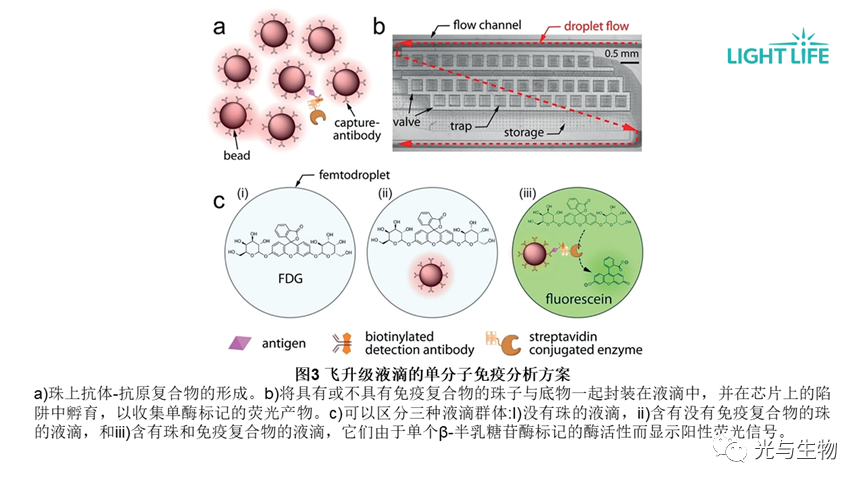 酶标记将底物转化为可溶性荧光产物,为了防止产物扩散,反应必须被限制在非常小的空间内,如病毒衣壳、脂质囊泡、微流体液滴、飞升阵列等。