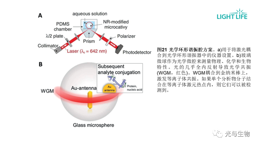 • 回音壁模式(WGM)微环谐振器可用于检测无标记分子(图21),分析物与光环谐振器的结合导至谐振波长的移动。
