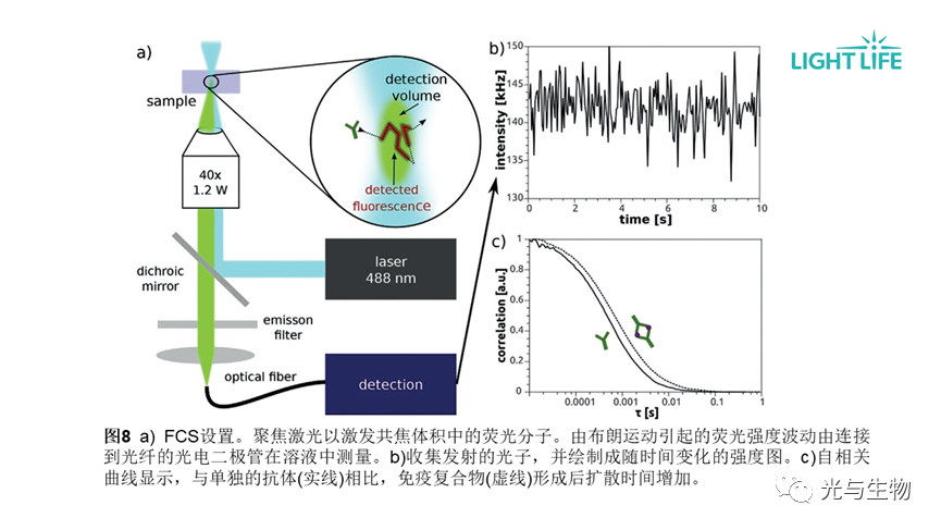 • 荧光相关光谱(FCS)记录单分子水平的扩散,可以用来跟踪分子与其他分子的相互作用。通过FCS在单分子水平检测荧光标记分子,可免于清洗、分离步骤,降低表面非特异性结合,适用于均相免疫测定,但容易受到背景干扰。FCS免疫测定最简单的方案是基于免疫复合物形成后扩散速率的变化(图8)。