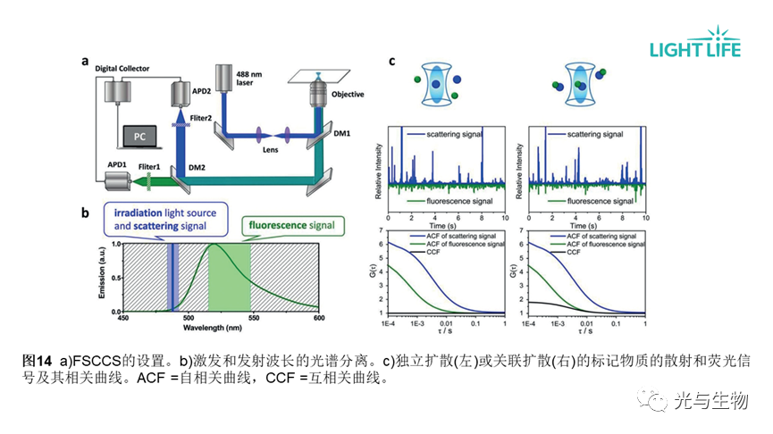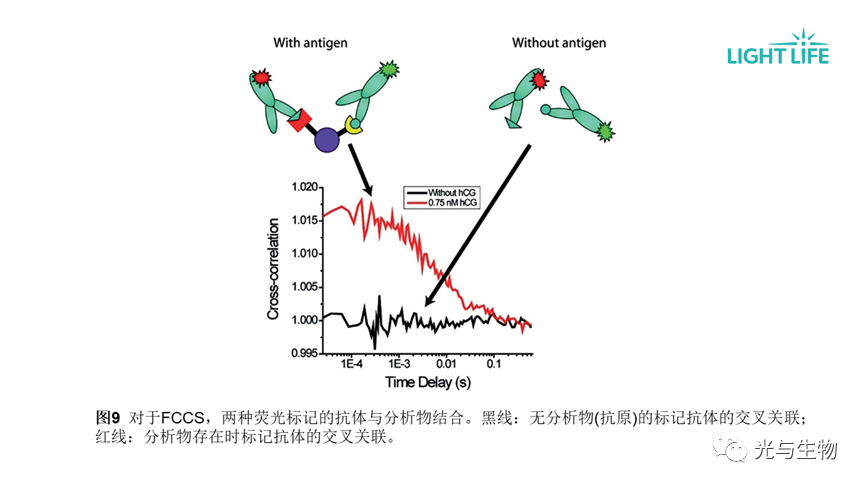 • 荧光交叉相关光谱(FCCS)使用两种光谱不同的荧光探针,通过不同的激发波长同时激发,并在两个不同的通道中检测,计算互相关曲线的振幅,以测量荧光探针与分析物的相互作用(图9)。可提高定量测定的灵敏度。