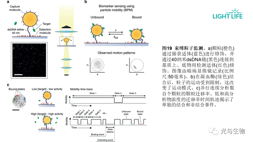 • 利用束缚粒子监测通过暗场显微镜开发了基于适体的夹心法进行凝血酶检测(图19)。