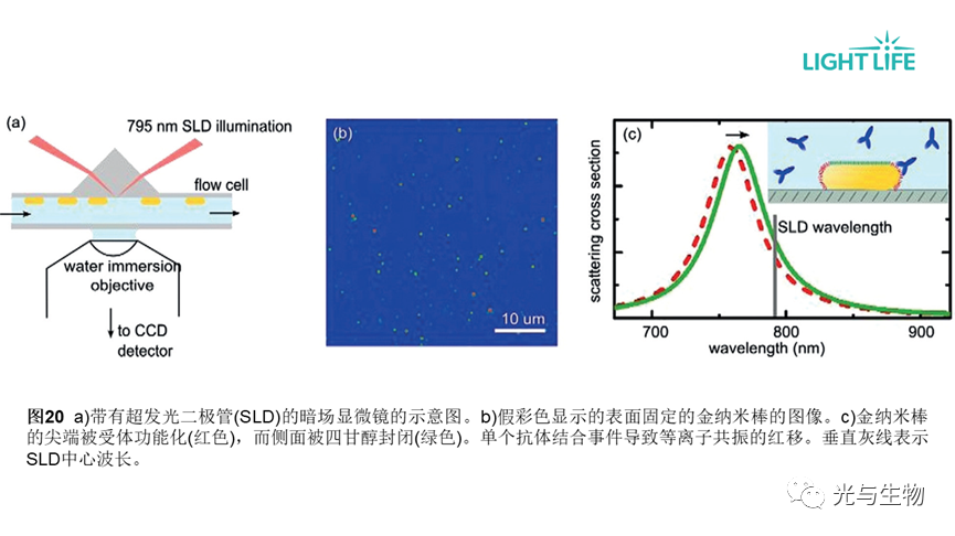 等离子体纳米结构的排列对分析物结合非常敏感。局部表面等离子体共振(LSPR)可用于追踪等离子体纳米颗粒附近局部折射率的变化,从而与分析物的存在联系起来。例如,使用金纳米棒检测生物素和抗生物素抗体的相互作用(图20)。