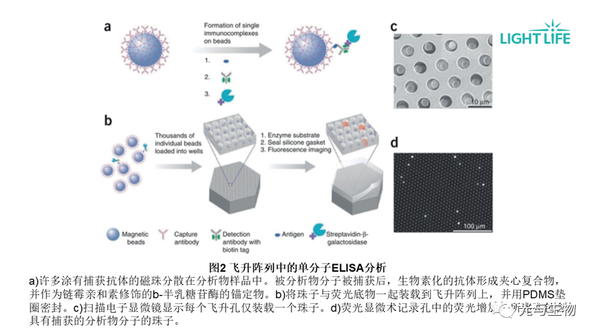 Walt团队首创了基于飞秒激光阵列中荧光酶促反应的单分子免疫分析。Quanterix公司已将其商业化,建立了Simoa单分子阵列平台(图2):带有捕获抗体的磁珠与分析物结合,通过链霉亲和素-生物素放大系统产生荧光信号,被装载到飞升阵列上。通过计算荧光孔的数量,以数字方式确定分析物浓度。