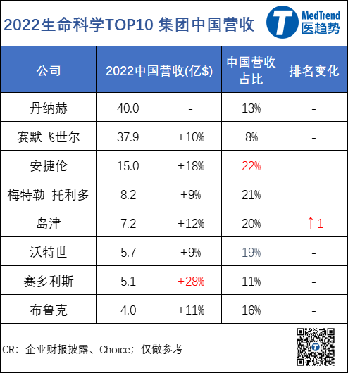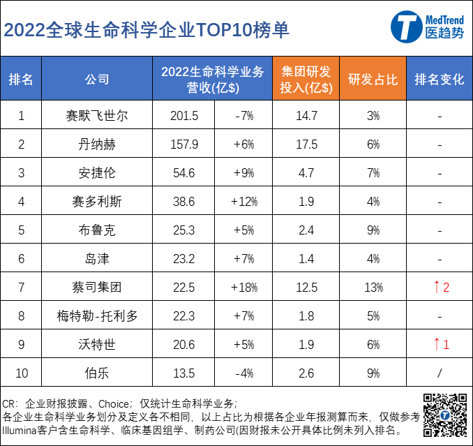 数据对比可见,相比2021年,2022年前三增速大幅下滑,其中赛多利斯已连续保持增速前三。