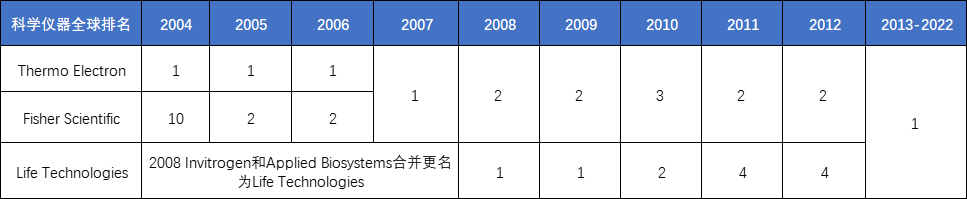 赛默飞世尔:专注并购,超十年业绩第一 赛默飞世尔是典型“扩张型”公司,扩张主要依靠并购;据Bloomberg数据,其近十年M&A支出占收入比重达到18%,创造了股价十年十倍的神话。合并前的Thermo Electron是全球NO.1的科学仪器公司;2007年与Fisher Scientific合并后位居前三;2013年收购Life Tech后又重新回到了第一的位置,并且保持至今。