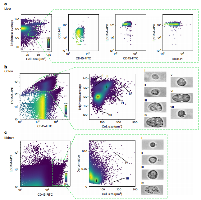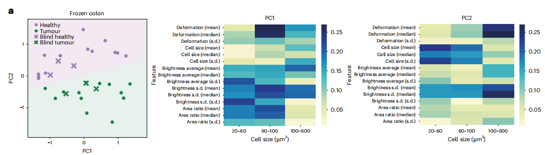 细胞物理性质的变化,如细胞大小、形状或形变,对某些疾病的病理学至关重要,并具有作为诊断或预后标记物的巨大潜力。在过去的几十年里,已经开发了多种工具来检测细胞的机械性质,包括微吸管技术、原子力显微镜等。不幸的是,这些传统技术不能实现高通量,并且需要深厚的专业知识才能进行操作,这限制了它们作为诊断工具的使用。实时荧光形变细胞仪(RT–FDC)是克服这些缺点的几种新型微流控技术之一,允许以无标签和高通量的方式评估单个细胞的物理性质,为临床诊断开辟了新途径。RT–FDC不仅速度快(每秒分析多达1000个细胞),而且除了细胞形变外,它还提供直接从细胞图像中获得的多维信息。RT–FDC的诊断潜力已在许多人类疾病中得到证明,从白血病到细菌和病毒感染,包括2019冠状病毒病。然而,到目前为止,该技术的适用性仅限于分析培养细胞或血液或骨髓的液体活检。 近日,一组来自德国的研究团队在杂志自然生物医学工程上发表了一篇题为机械分离组织活检的快速单细胞物理表型”的文章。 在这篇文章中, 研究团队提出了一种快速、无标签的固体组织活检诊断方法。该方法结合了使用组织研磨机(TG)对组织进行无酶机械解离,以快速简单地分离活的单细胞,以及使用RT–FDC对数千个单细胞的细胞物理表型进行连续评估。 结果表明,此方法可以基于微流体系统中细胞形变的测量来确定结肠组织中的炎症变化,以及可以区分健康组织和癌组织。这个流程可以在30分钟内交付结果 ,具有作为术中诊断流程的潜力,可以灵敏地检测活检中的病理变化,更广泛地说,可以以无偏见和无标记的方式识别和表征组织中的细胞群。 图片来源:Nature biomedical engineering 主要内容 组织单细胞物理表型检测概述 研究团队使用了组织研磨机,这是一种基于反向旋转的研磨齿排的机械解离装置(如下图),组装到Falcon管中。该设备自动执行预定序列的交替切割和研磨步骤,以从固体组织中分离单个细胞。总共使用TG或常规酶促方案处理了10种不同的小鼠组织进行比较。大多数组织的存活率为70-90%;细胞产量类似于酶解。机械离解的主要优点是处理时间不到5分钟,比酶促方案大大缩短。提取的速度有助于保存生物化学和生物物理表型。 接下来,使用RT–FDC对提取的单细胞进行分析。在RT-FDC测量中,可根据图像实时计算出几个物理参数,即形变、细胞大小、亮度、亮度标准差、纵横比和面积比。此外,荧光模块可用于检测细胞表面标记物的表达。 物理表型方法示意图。 图片来源:Nature biomedical engineering 小鼠组织单细胞物理表型检测 从肝脏、结肠和肾脏提取的细胞的物理参数分布的示例如下图。这些簇中的每一个都由具有相似物理表型和表面标记表达的细胞组成。例如,具有类似物理性质的细胞簇(本例由平均亮度和细胞大小定义)主要由上皮细胞粘附分子(EpCAM)阳性细胞组成,这表明可以完全使用图像衍生的物理参数以无标签的方式区分上皮细胞群。 由于物理表型参数提供了额外的信息深度,RT–FDC可以区分不同的亚群。在结肠上皮细胞中,只根据亮度和大小即可鉴定出七簇细胞。类似地,在肾脏的白细胞(CD45+)群体中,根据细胞大小和变形参数发现了四个不同的簇。使用RT–FDC分选模式,可以根据图像衍生的参数分离这些细胞群中的任何一个,并通过例如RNA测序分析其分子信息。 小鼠肝脏、结肠和肾脏样本的细胞物理参数散点图。 图片来源:Nature biomedical engineering 通过细胞物理表型检测组织炎症 炎症性肠病(IBD),如克罗恩病和溃疡性结肠炎,是与上皮/粘膜屏障受损和免疫细胞激活/募集有关的肠道慢性炎症性疾病。IBD的一种实验动物模型是将幼稚的T细胞过继转移到Rag1缺陷小鼠中以诱导实验性结肠炎(转移性结肠炎)。 通过研究转移性结肠炎过程中结肠细胞物理表型的变化可知,形变与细胞大小的散点图表明疾病和健康组织之间存在差异(图a)。总的来说,转移性结肠炎样本中形变中值显著减小,同时白细胞的百分比显著增加,这与过继转移的淋巴细胞浸润一致(图d)。 通过RT–FDC的细胞物理表型反映了组织炎症。 图片来源:Nature biomedical engineering 小鼠结肠肿瘤与健康组织的鉴别 研究团队将小鼠结肠肿瘤中分离的细胞与来自同一动物结肠健康部位的细胞进行了比较。结果表明,来自肿瘤组织的细胞的物理表型与对照样品显著不同。相比健康细胞,来自肿瘤的细胞具有显著更高的平均细胞大小和更高的变形以及面积比(图d)。肿瘤样品也表现出更大的异质性,细胞大小和面积比具有显著更高的标准偏差(图d,g)。统计结果显示,形变和细胞大小是小鼠结肠样本中肿瘤的独立预测因素。 肿瘤和健康小鼠结肠组织中细胞的物理表型。 图片来源:Nature biomedical engineering 人体活检中肿瘤和健康组织的区别 研究团队对从13个冷冻保存的结直肠癌癌症活检样本和13个来自相同患者的健康周围组织样本中分离的细胞进行了RT-FDC分析。对45个参数进行主成分分析,结果表明,肿瘤和健康样本沿着PC2很好地分离,主要是通过细胞的形变和大于100 µm2细胞的亮度标准偏差(图a)。PCA与逻辑回归相结合,用于预测六个盲样本的分类,所有六个样本均被正确分类为健康组织或肿瘤组织。 不仅如此,这种方法还适用于其他的组织癌症类型,可用组织样本中只有很少的癌症细胞存在(肿瘤细胞数低和广泛促结