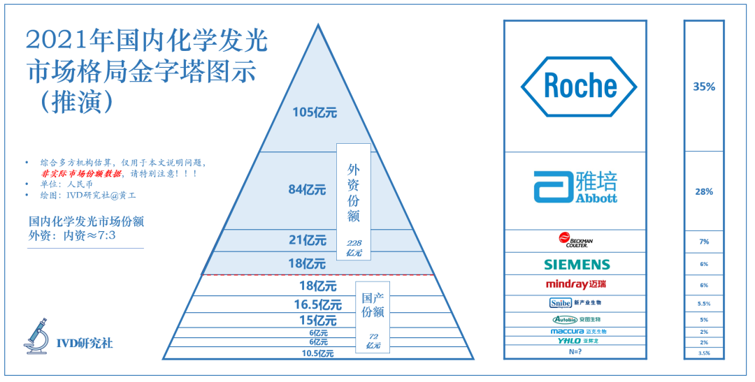 综合多方数据,到2021年底,国内化学发光市场约300亿元,占免疫诊断市场约88%。目前,呈现金字塔式竞争格局: 4+5+N 。N是多少?文末会为大家揭晓。基于此估算推演,国内化学发光格局如下:(1)外资份额:228亿元,其中,①罗氏诊断105亿元,占35%;②雅培84亿元,占28%;③贝克曼21亿元,占7%;④西门子医疗18亿元,占6%; (2)国产份额:72亿元,其中,⑤迈瑞18亿元,占6%;⑥新产业16.5亿元,占5.5%;⑦安图15亿元,占5%;⑧迈克6亿元,占2%;⑨亚辉龙6亿元,占2%;其他10.5亿元,占3.5%。(主要为国产企业,因此归入国产份额,这里有很小一部分外资,暂不计)(国内几家发光龙头,2022年报未披露,故而暂用2021年数据。300和88%,是估算而非实际数据,文章发出后争议声大,呼吁官方发布权威数据!!) 化学发光发展历程