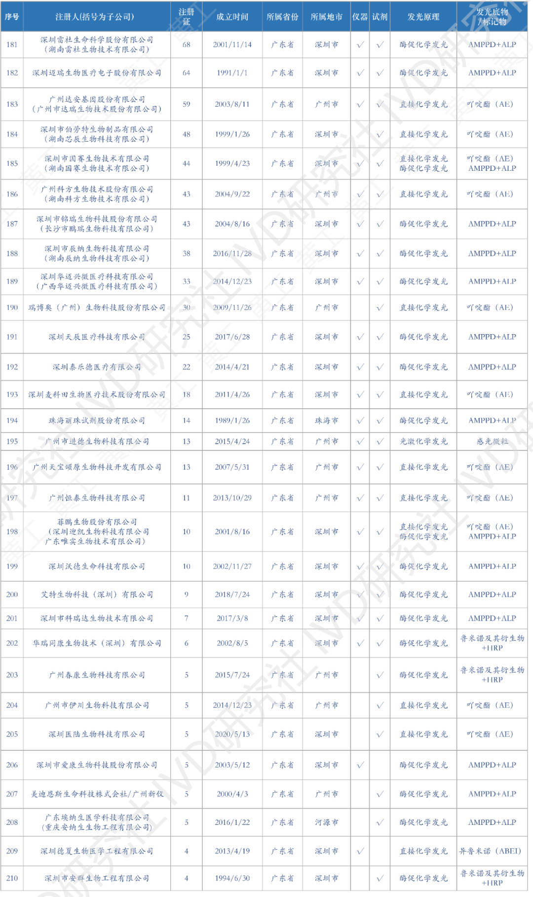 花了一个多月时间,终于把国内化学发光有效注册证数据,全部整理、清洗好了。到2022年12月31日,国产化学发光注册证共6968张;到2023年4月5日,进口化学发光注册证642张。两者加总,目前国内化学发光注册证,大约7600张,包括仪器、试剂、质控品、校准品等。去年统计的国产注册证,到2023Q1可能有增有减,但数据差异不会太大也不影响本文论述。这7600张注册证,登录国家药监局数据库,医疗器械板块,输入“化学发光”整理可得。(↑:目前国内化学发光有效注册证数据,国产+进口,总计7600条)基于上述数据,梳理出国内市场,化学发光相关企业共309家。这309家企业,包括子公司在内,很多不仅从事化学发光业务,也有IVD其他板块的,但都和化学发光有关,就一并整理了。另外,还对这309家企业,成立时间、所属省区市、母公司(控股公司)、业务包含仪器/试剂、发光体系等重要内容,做了进一步的分析整理,基于此表,可一览全国化学发光版图。(需要上表的朋友,可加入文末黄工的知识星球,有很多干货资料供下载,有技术群供交流)