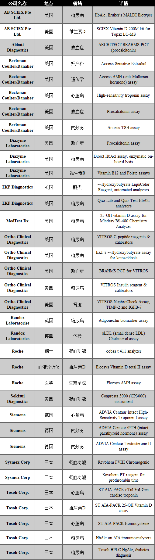 中心实验室的概念是将血液检测、生化检测、免疫测定、毒品检测、凝血测定和分子诊断等检测合并为一个自动化的连续过程。仪器的互联性和信息技术的进步,以适应检测方法的整合,推动了这一趋势,但最重要的可能是必须应对实验室运作费用的上升。虽然较大的机构可能仍然与其他学科分开进行分子测试,但较小的实验室,如医院实验室系统,已经开始不仅投资于中心实验室仪器,也投资于自动化。 将多个学科的常规实验室测试合并到中心实验室的趋势仍在继续。在过去的几年里,通常只能在专用免疫分析仪上找到的、已经迁移到综合工作站上的分析物的数量急剧增加,其中包括:D-二聚体(凝血)、维生素D、HbAlc和HgAlc(糖尿病)、BNP、NGAL、抗CCP、hsCRP、胱抑素、HIV、HCV、降钙素、HE4癌症标志物和格雷夫斯病的标志物。事实上,传统的专业壁垒,如微生物学、血液学、血库、免疫学,甚至解剖学病理学,正在逐渐消失。这种趋势使中心实验室成为真正的实验医学中心。 中心实验室的扩张是对一些环境条件的回应。经济压力和劳动力短缺的问题进一步加剧了。此外,实验室的菜单上还不断增加新的检测项目。目前,临床工作站至少有80种免疫测定可供选择。因此,预计大多数需要人工处理的常规测试有一天会实现自动化,这并不是非常不现实的。 对经济效益的推动使得甚至较小的医院也将不同学科的常规检验合并到一个中心实验室。为了满足这一需求,为小型实验室设计的新台式仪器是多分析工作站,可以运行化学和大量的免疫分析菜单。用于临床化学、免疫分析、血液学、凝血学、尿液分析和微生物学(尿液)的新仪器(大型和小型)现在已经开发出来,能够与实验室信息系统和中央实验室轨道连接。在过去的几年里,一些被添加到中心实验室仪器中的测试项目如下: 表6-1:核心实验室的部分分析项目 特别值得关注的是先进技术向中心实验室的迁移。随着Bruker MALDI Typer和bioMerieux’s的VITEK MS获得临床市场许可,看到微生物学和其他质谱测试进入中心实验室是有可能的。这种可能性得到了分析前样品制备系统的支持,该系统能对用于运输细胞学和微生物学样品的螺旋盖试管以及传统的血管进行解封和处理。 质谱专家AB Sciex已经推出了HbAlc的测试,该公司还提供维生素D的质谱套件。Newomics公司在Sciex质谱系统上的25-0H-维生素D2/D3的IVD-MS套件获得了CE标志。Liposcience正在开发一种硅微流控芯片,LC-MS,用于HgAlc。HgAlc在监测糖尿病血糖管理方面的重要性已经随着这种用于糖尿病诊断以及疾病监测的测试的上市而得到推进。更重要的是,主要的质量控制公司已经推出了HgAlc控制产品,以努力使测试结果标准化。 高灵敏度肌钙蛋白(hsTroponin)测试已成为急诊室病人急性心脏病分流的首选方法。在过去的几年里,一些这样的测试被加入到传统的心脏标志物小组中:BNP、肌红蛋白和肌钙蛋白。 由于对心脏病发作风险的认识不断提高,以及个人对控制胆固醇水平的认识不断增强,血脂和胆固醇检测的重要性也随之增加。测试量的整体增长是由于人口老龄化和越来越多的心血管疾病风险人群(包括高血压、糖尿病和腹部肥胖者)等因素所驱动。因此,血脂组合测试在中心实验室中的作用越来越明显。 维生素D的缺乏与各种疾病有关,包括癌症、心血管疾病、糖尿病、骨质疏松症、多发性硬化症、老年痴呆症和全因死亡率。这种对维生素D水平重要性的新认识推动了美国和全世界医生要求进行25-羟基维生素D总量测试的数量增加。 尽管研究表明高估了缺乏维生素D可能对整体健康和减少疾病风险的影响,但维生素D测试已从专用免疫分析仪和ELISA测试迅速转移到综合化学分析仪。MedTest Dx为他们的BS-480化学分析仪生产了一种25-OH维生素D测定;AB Sciex于2017年9月发布了其Topaz综合IVD LC-MS/MS系统,并独家推出了SCIEX维生素D 200M测定,这是FDA批准的第一种LC-MS维生素D测定。也就是说,免疫分析仪上的维生素D测定并没有绝迹。Tosoh Bioscience将该分析物纳入其AIA系列免疫分析仪的AIA-PACK测试杯的广泛组合中,而Sekisui Diagnositics公司自2016年以来一直与Qualigen公司合作,分销该公司的FastPack IP系统,这是一种护理点免疫分析系统,其测试菜单上有维生素D。 对于深奥的免疫测定,通常使用基于微孔板的ELISA测定来处理自动化平台上没有的测试。然而,随着实验室之间的不断整合,对特殊免疫测定的需求达到了需要自动化的量。因此,ELISA系统制造商已经将测试过程从独立的清洗器和读数器自动化到全自动工作站和解决方案,以便对临床实验室的化验和产量要求作出反应。 |