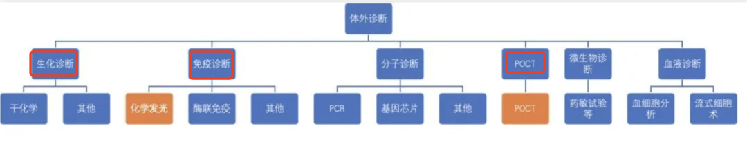 在头顶之上,一波又一波的IVD集采、统一编码、技耗分离、DRG/DIP时刻盘旋,成为催化整个行业转型的加速剂。 据《中国体外诊断行业年度报告》,去除新冠影响,2022年,国内IVD常规业务没有增长,预计2023年行业规模将总体下降。 后疫情时代,增量市场放缓,存量市场竞争加剧,各有各的难处,外企、民企都在试图破局。 打破一切“禁区”,IVD降价潮蔓延 集采是除了新冠之外,近年来最大的行业变量。 从2021年开始,IVD集采,已经从化学发光的“一时兴起”,渗透到生化肝功、POCT等领域。IVD有组织、有步骤的集采扩围,正在打破一切价格“禁区”。 体外诊断行业细分领域(红框代表已集采领域),来自《中国医疗器械蓝皮书(2019 版)》 外企方面,态度两极,观望多于参与: