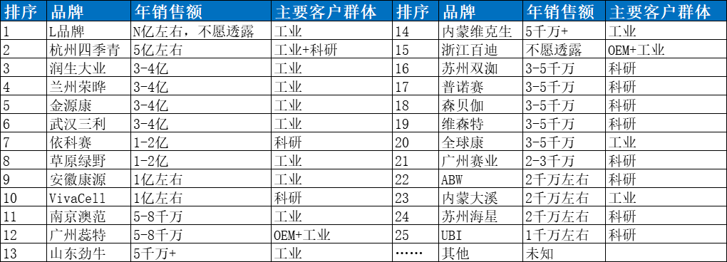 实际上国产牛血清(含胎牛、新生牛、小牛)最大的厂商是不愿意透露的L品牌,2022年销售额达到了N个小目标,科研口的头号交椅依科赛按总销售额仅仅排名第7,这是不是突破了你的“刻板印”。其他更多的排名情况请看下表: