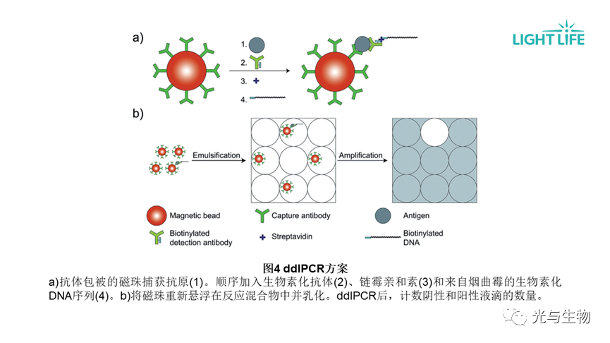 该系统检测前列腺特异性抗原(PSA)和肿瘤坏死因子-a (TNF-a)的检测限(LOD)达到了1.5 fg/mL和2.5 fg/mL。其他临床相关分析物包括癌症生物标记物、尿液生物标记物、HIV的p24蛋白、以及血液中神经丝轻链蛋白(NFL)、tau蛋白、唾液中的皮质醇小分子等。此外还可通过使用两种不同的酶/底物标记进行多重分析。基于产生油包水微滴的不同方法,乳化方法产生的微液滴往往不均匀,而微流体装置可以产生和处理更均匀的微液滴,可用于建立磁珠酶联免疫分析(图3)。LOD可达到46 fM,线性范围可达到0.046-4.62 pM。3.用于PCR扩增的DNA标记 微芯片上的微流体能够在皮升或飞升反应容器中快速分离单链DNA,随后进行PCR扩增,LOD可达到每毫升40个RNA分子。基于液滴的数字免疫PCR (ddIPCR)使用磁珠作为固体支持物,DNA作为标记物,PCR用于信号放大,较标准ELISA可将LOD降低100-10000倍(图4),但清洗步骤不易实现。数字PCR与邻位连接技术(PLA)相结合可进一步提高分析的精确度。4.荧光分子标记 单个荧光分子的检测依赖于共焦显微镜和全内反射显微镜(TIRF)。根据不同的检测形式可分为:- 用于检测增强型绿色荧光蛋白(EGFP)和肿瘤抑制蛋白p53的单分子检测(图6)