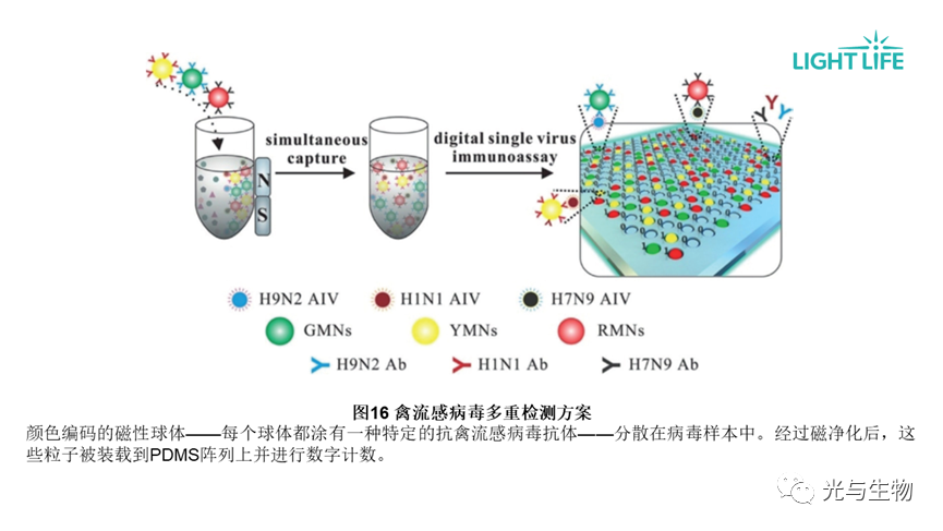 - 使用彩色编码磁珠同时检测三种不同类型禽流感的单个病毒颗粒(图16),LOD达0.02 pg/mL;