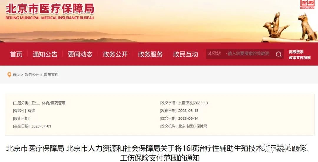 2023年6月15日,北京市医保局发布通知,自7月1号起,16项治疗性辅助生殖技术项目纳入北京市基本医保,按医保甲类纳入门诊报销。项目包含促排卵检查、采卵、人工授精、胚胎移植术等。 根据官方解读,这16项治疗性辅助生殖技术项目(见文末)按医保甲类纳入门诊报销,且住院不报销,只限门诊报销。 据悉,北京市具有辅助生殖技术资质的医疗机构共18家。其中,北京协和医院、北京大学第一医院、北京大学人民医院等16家为医保定点医疗机构(见下图),可享医保基金报销。其余非医保定点医院的辅助生殖项目,医保基金不予支付。 此前,国家医保局曾在提案答复中称,将逐步把适宜的分娩镇痛和辅助生殖技术项目纳入医保支付范围。 不过,因为辅助生殖项目费用高昂,大部分地区都采取的是给予补贴的政策。北京是少数且首个直接将辅助生殖纳入医保的地区,去年2月北京医保局就曾发文称将辅助生殖纳入医保报销,此后进展一度搁置,直到本次发文。 2022年8月,国家卫健委、国家发改委等17部门印发《关于进一步完善和落实积极生育支持措施的指导意见》(下称“《指导意见》〞) https://www.gov.cn/zhengce/zhengceku/2022-08/16/content_5705882.htm 其中首次明确提出,指导地方逐步将适宜的分娩镇痛和辅助生殖技术项目按程序纳入医保(含生育保险)基金支付范围。 据官方解读,本次《通知》的政策调整依据之一即为前述《指导意见》。换而言之,本次《通知》是《指导意见》在北京市的具体落地。 此外,杭州市、荆门市、辽宁省等省市的医保、商保先后都在辅助生殖项目上有所尝试。 据了解,6月1日,辽宁省医保局发文,将至少17条辅助生殖项目纳入生育保险支付。具体将于7月1日起实施。 #01 国内辅助生殖市场潜力可观 过去30年间,中国人口结构发生重大变化,由金字塔型转变为橄榄型,少子化与老龄化问题日益突出,辅助生殖“调结构”应用价值受到重视。 与此同时,不孕症已成为困扰许多育龄夫妇的重大生殖疾病之一。根据乔杰院士团队的最新全国生殖健康流行病学调查分析结果显示,2007-2020年间,我国不孕发病率已从12%升至18%。辅助生殖技术被认为是治疗不孕症的最有效方法之一。 Frost & Sullivan报告指出,2018-2023年,中国辅助生殖服务市场年复合增长率预计为14.5%,并将持续保持较高的增长态势。据开源证券推算,2023年国内辅助生殖市场规模或将突破400亿元,长期市场发展潜力超千亿元。 #02 辅助生殖相关配套医疗器械 辅助生殖是指通过医疗辅助手段,对人的卵子、精子、受精卵或胚胎进行人工操作,使不孕不育夫妇妊娠的技术,目前我国辅助生殖技术主要可分为三种:人工授精(AI)、配子移植、体外受精(IVF)。基于患者的差异性病症,不同技术的组合可搭配出更具针对性的治疗方案。 辅助生殖各项服务需要配套医疗器械,如辅助生殖用液、检测试剂、固体耗材及仪器等。根据自2018年8月1日开始实行的,国家食品药品监管总局的新版《医疗器械分类目录》(2017年第104号), https://www.nmpa.gov.cn/xxgk/ggtg/qtggtg/20170904150301406.html?type=pc&m= 辅助生殖医疗器械主要分为以下5个类别: #03 创新研发及国产替代逐渐成为趋势 据西南证券研报,辅助生殖术前检测试剂己实现全面国产化。主要生产商包括亚辉龙、中国同辐全资子公司北方生物、万孚生物等。 但相关三类医疗器械多由外资企业垄断。 此外,据健识局研报,辅助生殖治疗中,人工授精 (AI) 和试管婴儿的占比分别为30%和 70%。试管婴儿妊娠率高达约50%,远超人工授精的20%。 目前,该技术已经发展至三代,分别为传统试管婴儿治疗(一代)、采用卵胞浆内单精子注射技术 (ICSI)的试管婴儿治疗(二代)和采用胚胎植入测试 (PCT) 的试管婴儿治疗(三代)。需要注意的是,这一分类并非指技术的领先程度,而是针对不同患者和适应证。第一、第二代技术分别针对女性不孕、男性不育问题,第三代技术则针对优生优育。