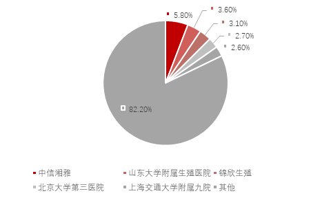 来源:国家卫计委、高禾投资研究中心 四、 辅助生殖行业发展趋势分析(一) 与商业保险合作将会成为机构的发展方向商业保险帮助患者缓解由于辅助生殖失败带来的经济压力。我国生育专家表示,辅助生殖周期数量将随女性年龄增加而增加,35岁以下女性做超过1次周期以上的比例为43%,35-39岁的女性对应比例达到61%,40-42岁的女性对应比例达到74%。人工授精单周期平均价格约为0.5万元,IVF单周期平均价格约为3.5万元,IVF较人工授精治疗更普遍,按照2次周期来算,费用达到7万,价格昂贵且存在失败的风险。泰康保险在2017年率先推出全国首款试管婴儿保险,锦欣生殖的旗下医院也与商业保险公司合作推出保险产品。目前我国并未设置辅助生殖医保,商业保险将会降低不孕夫妇的经济压力,间接减少心理压力,提高移植成功率,扩大辅助生殖行业需求,预计未来会有更多辅助生殖机构与商业保险公司展开合作。 (二) 拓展服务,延伸产业链,打造全方位发展辅助生殖中心产业链纵向延伸,全方位、一体化服务趋势逐渐加强。对于一般的妇产医院,其服务可覆盖为:产科——儿科/妇科——辅助生殖——月子中心。对辅助生殖中心而言,未来发展不仅局限于单一的辅助生殖服务,不仅可以向上扩展上游的辅助生殖试剂、耗材、设备供货商服务,也可以打通下游,提供月子中心服务,在患者妊娠成功后,向其提供月子服务,使患者享受一站式服务。月子中心可以提供包括产后修复、新生儿护理、母婴营养、美丽塑形等多样化服务。辅助生殖中心会全方位扩展业务领域,打造一体化发展的辅助生殖机构。 五、 辅助生殖行业竞争格局分析目前,国内的辅助生殖医疗机构有公立医院占据主导地位,行业内现有持牌辅助生殖服务机构的公立医院占90%,如北京大学第三医院、山东大学附属生殖医院等。非公立的辅助生殖机构包括中信湘雅生殖与遗传专科医院(中信湘雅)、锦欣生殖医疗集团和爱维艾夫医疗集团等。按照取卵周期计算市占率,2018年辅助生殖医院前10名的总市场份额为26%,前20名为36%,竞争格局高度分散,其中中信湘雅生殖与遗传专科医院占据5.8%的市场份额,排市场第一。高等级公立医院凭借强大的科研实力及优秀的医生团队具有较强竞争力,但覆盖区域和接收患者能力有限,市场整体供不应求。 图 2018年中国辅助生殖服务中心前五名