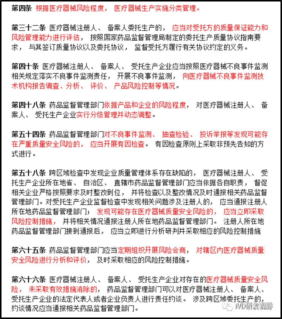 2.法规要求提到风险的医疗器械管理文件非常多,越是下层与风险密切相关的文件,风险要求越具体,如《医疗器械不良事件监测和再评价管理办法》,出现风险达51次。以下仅摘录《医疗器械监督管理条例》、《医疗器械生产监督管理办法》中提到的风险条款。2.1《医疗器械监督管理条例》提到风险共21处,主要在以下方面需要考虑风险,应用风险管理进行监管。 ③医疗器械注册或备案人应制定和实施上市后的风险管控计划,报告不良事件产品风险控制情况:④第三类医疗器械中临床高风险产品的临床试验需要审批: