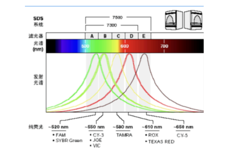 在多重qPCR中针对不同靶标的检测,需要设计不同的探针、选用不同光谱范围的荧光基团。虽然许多荧光光谱相似的荧光基团的最大发射波长不同,但在附近的波段内,它们仍然会相互重叠,因此荧光基团的发射光谱之间的相互干扰就成了限制多重PCR发展的最大难题。目前普遍水平能够调配到4-6色荧光通道之间的不干扰,再继续增加信号通路干扰越大。