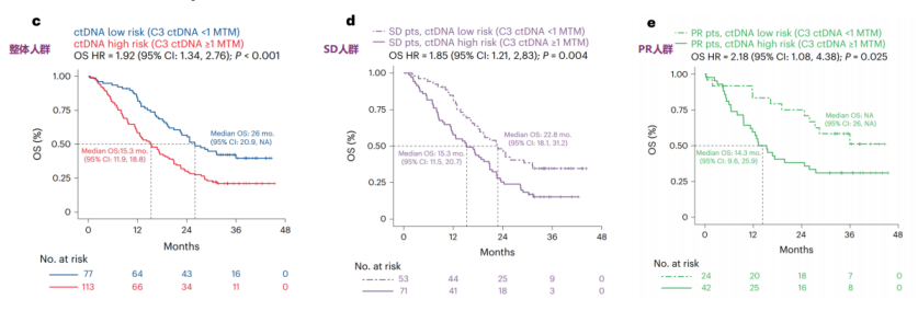 该研究证明,靶向治疗第8周经MRE评估EGFR清除的患者具有更长的PFS及OS。 另外,一项奥希替尼治疗72例EGFR T790M阳性IIIB-IV期NSCLC患者4,显示靶向治疗第6周MRE清除的患者具有更长的PFS及OS。 图注:在奥希替尼治疗第6周ctDNA清除与更好的PFS (12.5 vs. 5.8 months, P=0.022) 和OS (NR vs. 13.1 months, P=0.009) 有关。 进一步患者精细化分层: 另外,MRE也可在免疫治疗第6周筛选出OS更长的SD患者。 图注:C:C3D1的ctDNA 水平在LOD检测限以下的患者OS更长 (<1 MTM/mL, ctDNA 低风险)(精确P值为0.00029871)。D、E:治疗第6周的SD及PR患者通过C3D1进一步分层,ctDNA低风险患者OS更长。 而且在靶向治疗中,有研究提示MRE与RECIST结合可以更精准评估EGFR突变型NSCLC(尤其是SD患者)的治疗疗效6。 图注:靶向+化疗治疗8周时,与未清除相比,ctDNA清除的SD患者mPFS (16mon vs 10mon)和mOS(NR vs 10mon)延长。 29个PD黑色素瘤患者(20个真PD+9个假进展)进行ctDNA动态监测(从基线到治疗12周)7,显示MRE也可以进一步区分哪些患者是“真进展”,哪些患者是“假进展”,“ctDNA分子应答”型来预测真进展的灵敏度是90%,特异性为100%! 早期提示进展风险: MSKCC临床试验中的NSCLC患者(n=363)8,约20% PFS≥12个月,其中31位患者进行血浆监测,中位监测时间为26.7个月。研究表明,MRE阳性的免疫治疗获益患者具有进展风险,4例患者ctDNA阳性并全部进展,27例ctDNA阴性患者中25例未进展,ctDNA阴性患者的中位EFS显著长于阳性者。 同样在靶向治疗中,研究提示MRE变化早于影像学,可通过MRE升高的靶向治疗患者具有进展风险9。 在TATIN 2线队列(n=23)10,19例PD患者中有13例(68%)在影像学PD前或同时检测到原发性EGFR驱动基因升高: