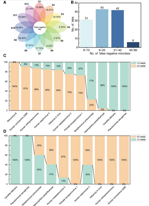 当评估假阴性结果时,实验室被要求报告每个样品超过特定实验室设定阈值的所有微生物。没有实验室能准确检测12个样本中所有90种添加的微生物,浓度范围在1×102 - 1×106拷贝/毫升。观察到的假阴性结果范围从6到72种,几乎一半的实验室(39.34%,48/122)漏报了超过20种微生物(图B)。当微生物浓度≥104拷贝/毫升,假阴性结果主要来自RNA病毒;DNA病毒,真菌和细菌的检测能力更好。