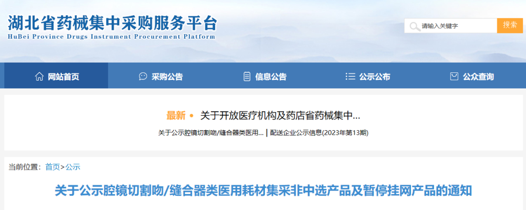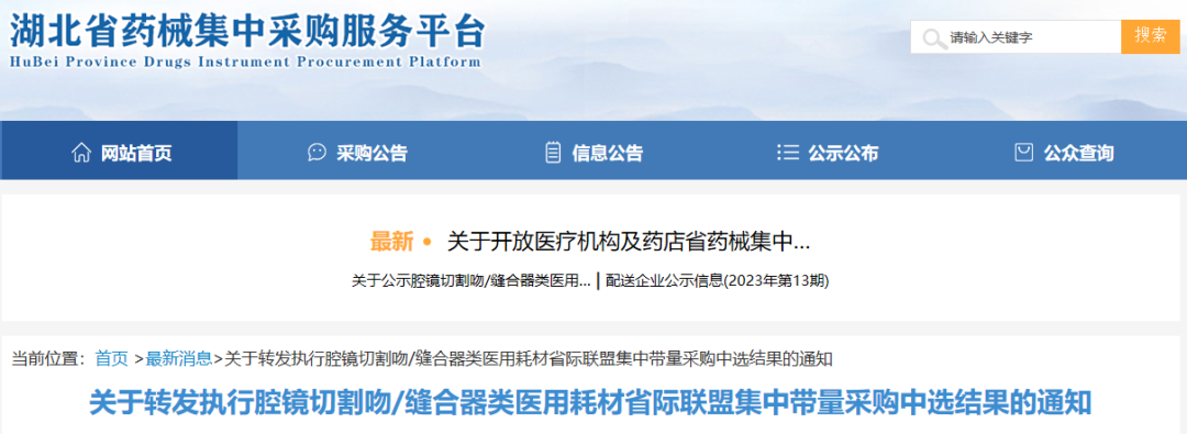 6月6日,湖北省药械集采平台发布了《关于转发执行腔镜切割吻/缝合器类医用耗材省际联盟集中带量采购中选结果的通知》。文件明确要求: