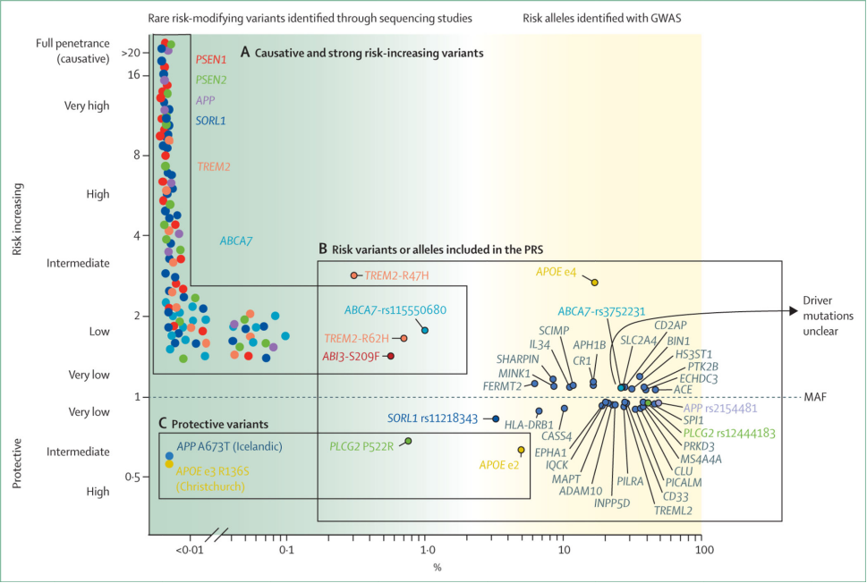 MAF(x轴)是一个非参考(变异)等位基因在群体中出现的频率。携带OR=1的变异携带者和非携带者患阿尔茨海默病的几率相同,携带OR >1的变异与患阿尔茨海默病的风险增加相关,携带OR <1的变异与保护作用相关(y轴)。(A)的致病性或强风险增加的变异。由于极端变异罕见而无法估计的个体罕见变异的示意图。大家系的连锁研究表明,PSEN1、PSEN2和APP的特定罕见变异导至常染色体显性阿尔茨海默病,在某些情况下,发病年龄早在40岁。值得注意的是,并非这三个基因的所有变异都会导至常染色体显性阿尔茨海默病;有些可能是风险修饰因子或非致病性的。此外,越来越多的证据表明,SORL1基因中的某些变异是70岁之前阿尔茨海默病的病因。在基于基因的测试中发现了SORL1、ABCA7和TREM2基因变异的阿尔茨海默氏病关联;携带者可能来自具有阿尔茨海默病遗传模式的小家系,提示常染色体显性遗传。(B) GWAS命中是常见的(按惯例,MAF >1%)变异,代表风险等位基因,在阿尔茨海默病患者和对照组中出现显著不同的频率。每个变异都由发生变异的基因表示,或者当变异是非编码的时,由最接近变异的基因表示(用深灰色表示)。(C)保护性变异是(非常)罕见的变异,被认为对年龄相关或疾病相关的认知衰退风险因素具有抵抗力。GWAS=全基因组关联研究。MAF=次要等位基因频率。或=比值比。PRS=多基因风险评分