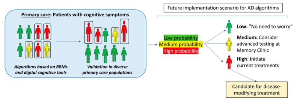 在初级保健中,我们需要简单而准确的方法,以便能够在有认知问题的病人中识别不同的潜在神经退行性疾病。理想情况下,基于血液的生物标志物和临床评估可用于确定患者患有神经退行性疾病(如阿尔茨海默病(AD))的概率,这将改善患者管理,包括关于治疗或转诊到专门诊所的决定。然而,非常重要的是,新的诊断算法(基于血液中的生物标志物)在临床实践中实施之前,要根据相关的参考标准在大型和多样化的初级保健人群中进行前瞻性验证。