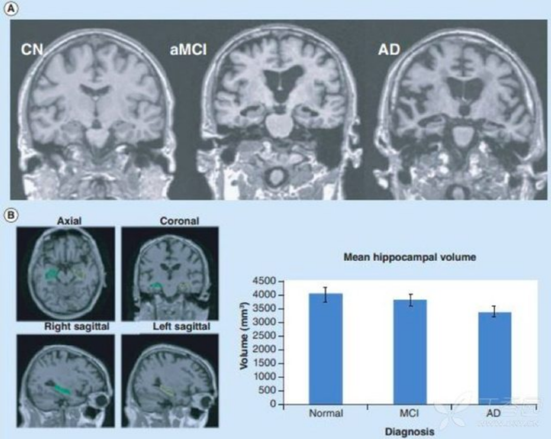 (右图:AD患者的大脑皮层萎缩、脑室扩大)