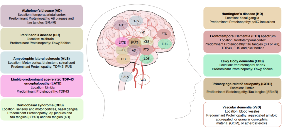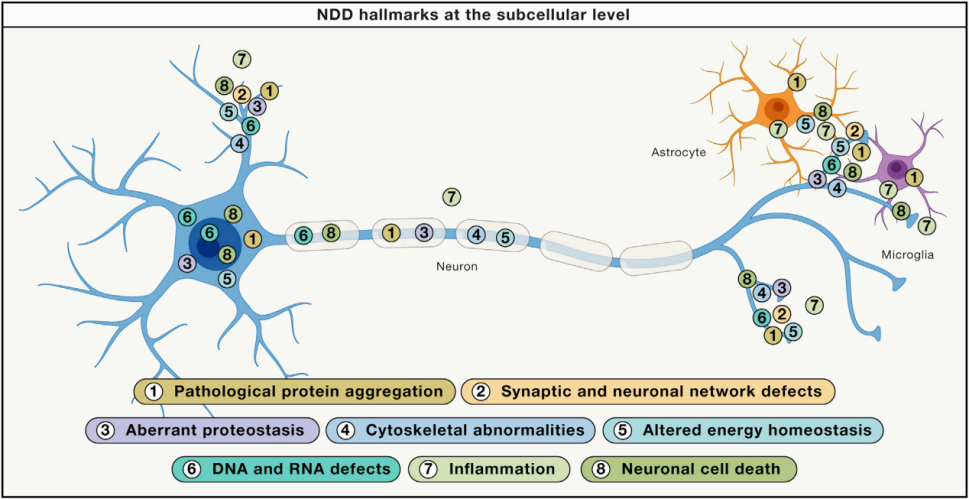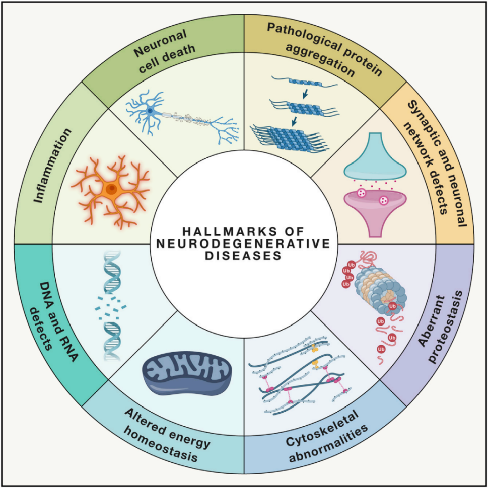 Wilson DM 3rd, Cookson MR, Van Den Bosch L, Zetterberg H, Holtzman DM, Dewachter I. Hallmarks of neurodegenerative diseases. Cell. 2023 Feb 16;186(4):693-714. doi: 10.1016/j.cell.2022.12.032. PMID: 36803602.