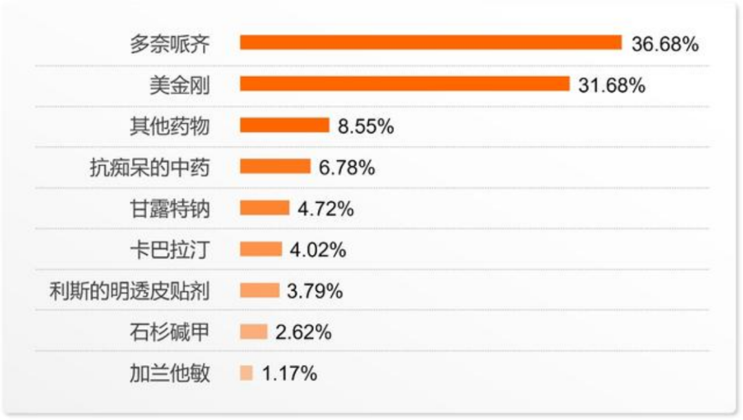 正在服药的城市患者中,有70.29%服药时间在1年以上;在农村,有66.67%的受访患者服药时间不足1年。使用的抗痴呆药物比例最高的是多奈哌齐(36.68%),其次是美金刚(31.68%)。